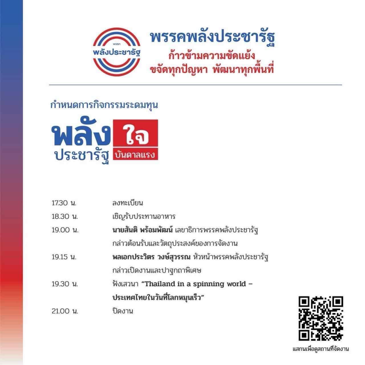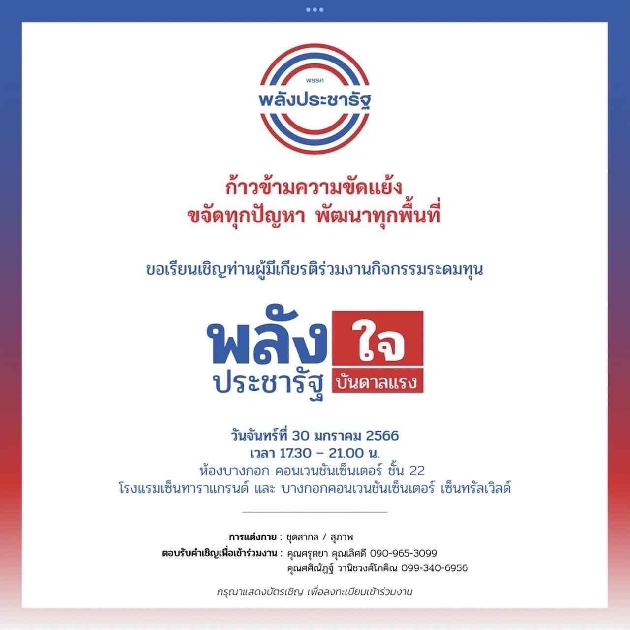 ขณะที่วันเดียวกัน เวลา 17.30 น. พรรคพลังประชารัฐ จัดงานระดมทุน “พลังประชารัฐ ใจบันดาลแรง” ที่โรงแรมเซ็นทาราแกรนด์ และบางกอกคอนเวนชั่นเซ็นเตอร์ เซ็นทรัลเวิล์ด.