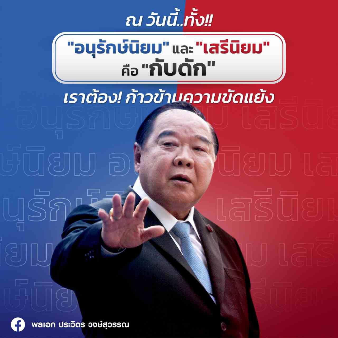 วันที่ 27 ก.พ. ผู้สื่อข่าวรายงานว่า เพจเฟซบุ๊ก “พลเอกประวิตร วงษ์สุวรรณ” ได้มีการโพสต์ข้อความ “ทำไมต้องก้าวข้ามความขัดแย้ง” และภาพ พล.อ.ประวิตร วงษ์สุวรรณ รองนายกรัฐมนตรี ในฐานะหัวหน้าพรรคพลังประชารัฐ ที่พื้นหลังเป็นสีน้ำเงิน-แดง และข้อความบนภาพว่า “ณ วันนี้ทั้งอนุรักษ์นิยมและเสรีนิยม คือกับดัก “เราต้องก้าวข้ามความขัดแย้ง”