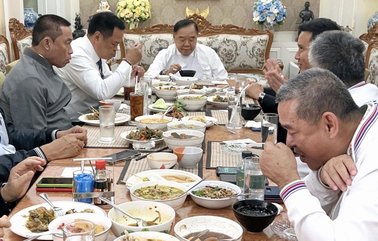 ต่อมาเวลา 12.00 น. นายอนุทิน ชาญวีรกูล หัวหน้าพรรค ภท. นายศักดิ์สยาม ชิดชอบ รมว.คมนาคม เลขาธิการพรรค ภท. และนายชาดา ไทยเศรษฐ์ ส.ส.อุทัยธานี รองหัวหน้าพรรค ภท. เข้าพบ พล.อ.ประวิตร ร่วมรับประทานอาหารกลางวัน ที่มูลนิธิอนุรักษ์ป่ารอยต่อ 5 จังหวัด มีแกนนำพรรคพปชร. อาทิ นายสันติ พร้อมพัฒน์ รมช.คลัง เลขาธิการพรรค พปชร. นายชัยวุฒิ ธนาคมานุสรณ์ รมว.ดิจิทัลเพื่อเศรษฐกิจและสังคม นายวิรัช รัตนเศรษฐ รองหัวหน้าพรรค นายรงค์ บุญสวยขวัญ กรรมการบริหารพรรค และนายเรืองไกร ลีกิจวัฒนะ สมาชิกพรรคพปชร.ร่วมโต๊ะ ใช้เวลาประมาณ 1 ชั่วโมงครึ่ง ทั้งนี้นับเป็นการรับประทานอาหารร่วมกันเป็นครั้งที่ 2 หลังจากเพิ่งรับประทานกันไปเมื่อวันที่ 15 มี.ค.ที่นายอนุทินยอมรับชัดเจนว่ามีการพูดคุยดีลจับมือขั้วการเมืองใหม่เรียบร้อยแล้ว