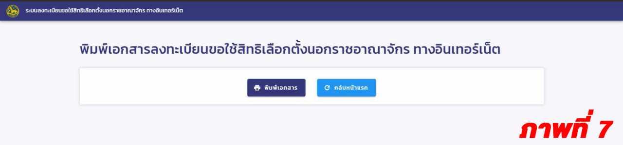 3. เข้าสู่หน้าพิมพ์เอกสาร สามารถกดปุ่ม “พิมพ์เอกสาร” เพื่อพิมพ์เอกสาร PDF คำขอลงทะเบียนใช้สิทธิ์เลือกตั้ง/ขอเปลี่ยนแปลงการใช้สิทธิ์เลือกตั้งนอกราชอาณาจักรและขอกลับมาใช้สิทธิ์เลือกตั้งในประเทศไทย (ภาพที่ 7-8)
