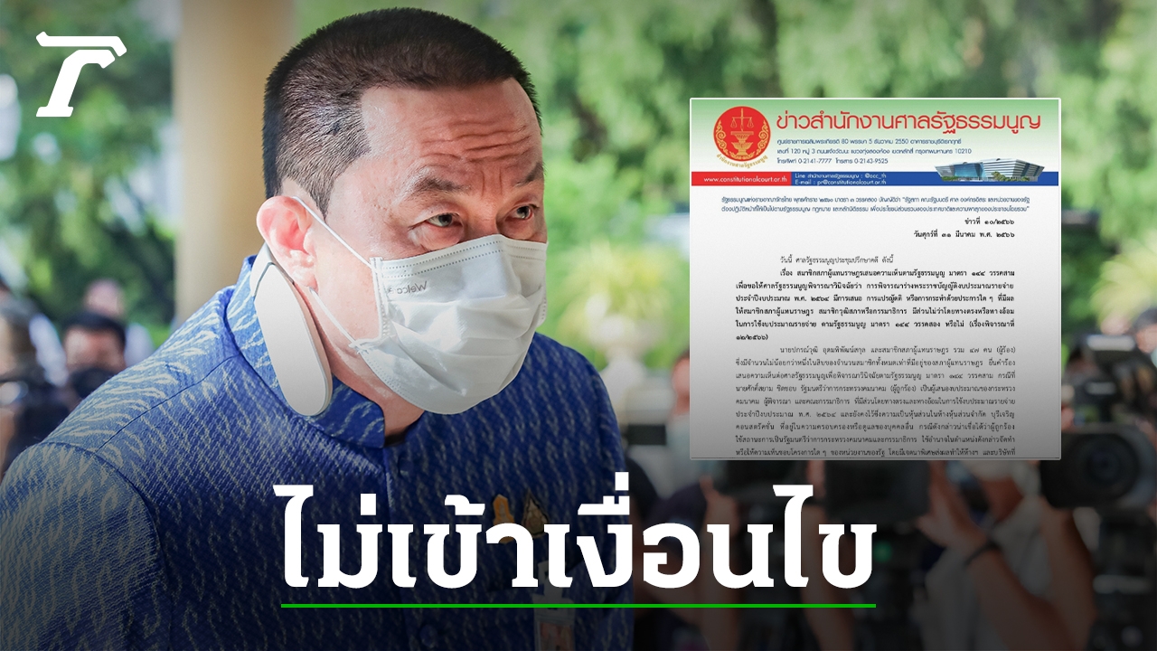 มติเอกฉันท์ ศาลรธน. ไม่รับคำร้อง ฝ่ายค้านร่วมลงชื่อ ยื่นฟัน "ศักดิ์สยาม" รมว.คมนาคม ปม เสนองบฯ ปี 64 เอื้อประโยชน์บริษัทบุรีเจริญ ชี้ ไม่เข้าเงื่อนไข หรืออยู่ระหว่างการพิจารณางบในสภาผู้แทนราษฎร