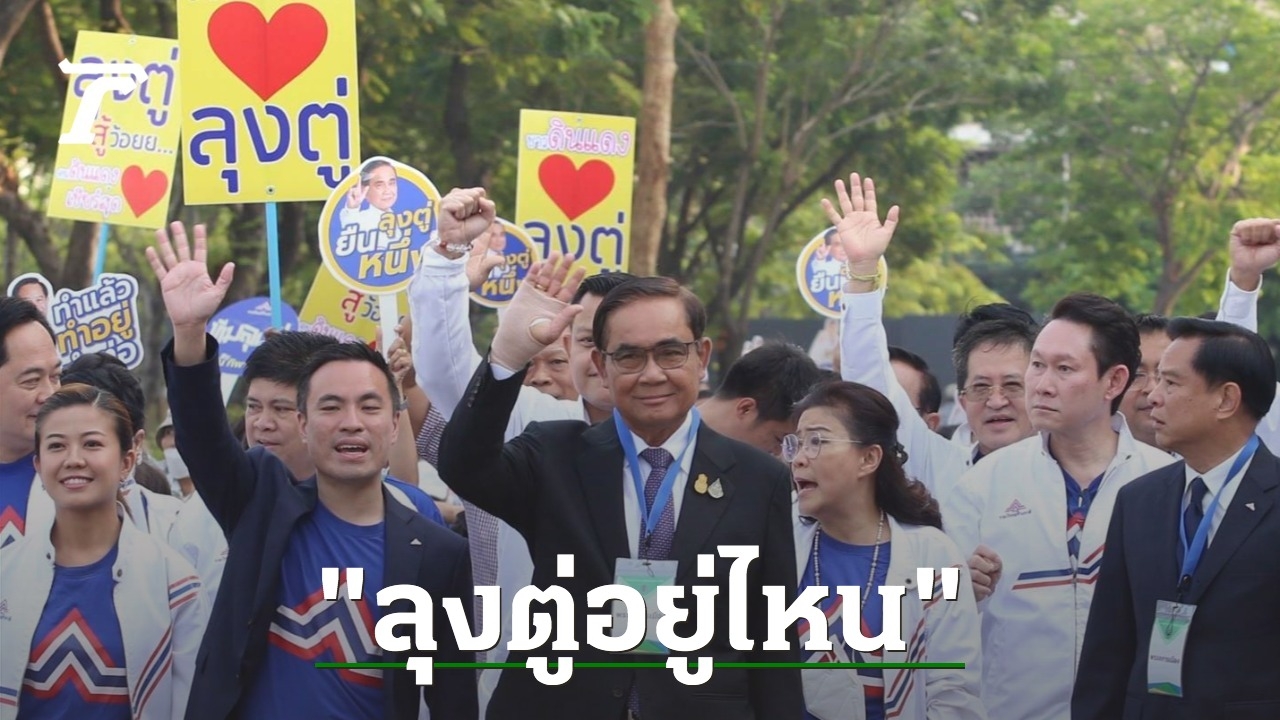 “ลุงตู่ ลุงตู่อยู่ไหน อยู่ไม่ใกล้ ไม่ไกล อยู่รวมไทยสร้างชาติ เลือกลุงตู่ เลือกคนดีมือสะอาด เลือกรวมไทยสร้างชาติ ได้ลุงตู่ ได้ลุงตู่