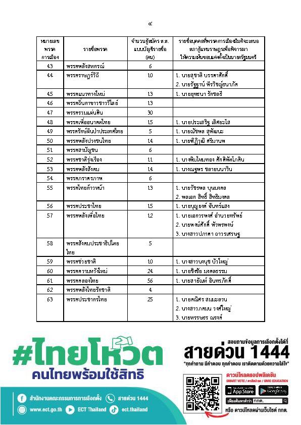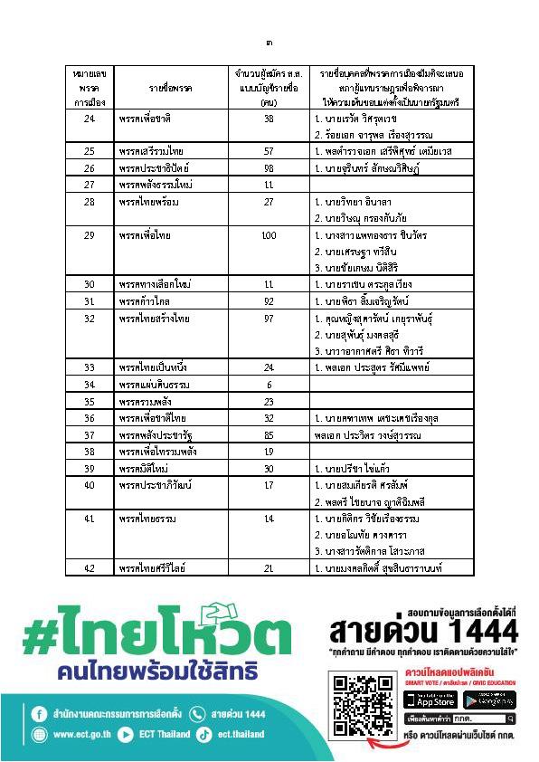 3. พรรคการเมืองแจ้งรายชื่อแคนดิเดตนายกรัฐมนตรี ทั้งหมด 43 พรรคการเมือง รวมจำนวน 63 รายชื่อ