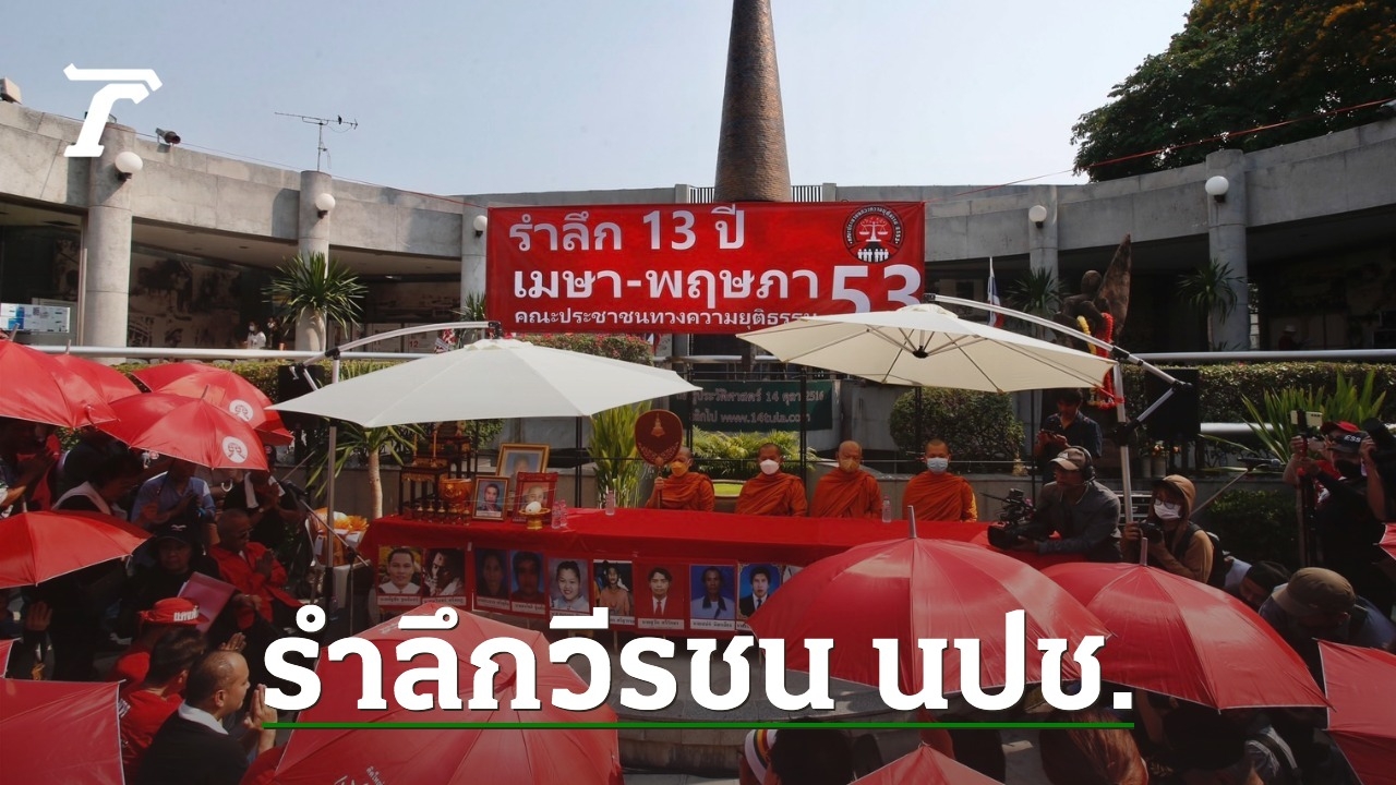 วันที่ 10 เม.ย. 2566 ที่อนุสรณ์สถาน 14 ตุลา สี่แยกคอกวัว ถนนราชดำเนินกลาง คณะประชาชนทวงความยุติธรรม 53 (คปช.53) นำโดยนางธิดา ถาวรเศรษฐ อดีตประธาน นปช. ในฐานะเลขาธิการคปช.53 จัดงานรำลึก 13 ปี เหตุการณ์สลายชุมนุม นปช. เม.ย.-พ.ค. 53 ท่ามกลางเหล่าญาติผู้เสียชีวิต นักเคลื่อนไหวที่ส่วนใหญ่เป็นผู้สูงวัย ทั้งแกนนำนปช.ตลอดจนตัวแทนพรรคการเมืองต่างๆ เข้าร่วม สำหรับพิธีประกอบด้วย การทำบุญถวายสังฆทานกรวดน้ำเพื่ออุทิศส่วนกุศลให้ผู้วายชนม์ การวางพวงหรีดโดยเหล่าแกนนำ และตัวแทนพรรคการเมือง เช่น พรรคเพื่อไทย นำโดยนายภูมิธรรม เวชยชัย นายชูศักดิ์ ศิรินิล พรรคก้าวไกล นำโดยนายชัยธวัช ตุลาธน นายรังสิมันต์ โรม พรรคเสรีรวมไทย นำโดยนายสมชัย ศรีสุทธิยากร นอกจากนี้ยังมี พรรคประชาชาติ พรรคเส้นด้าย ไทยสร้างไทย กลุ่มทะลุฟ้า องค์การบริหารนิสิตจุฬาฯ กลุ่ม wevo เป็นต้น