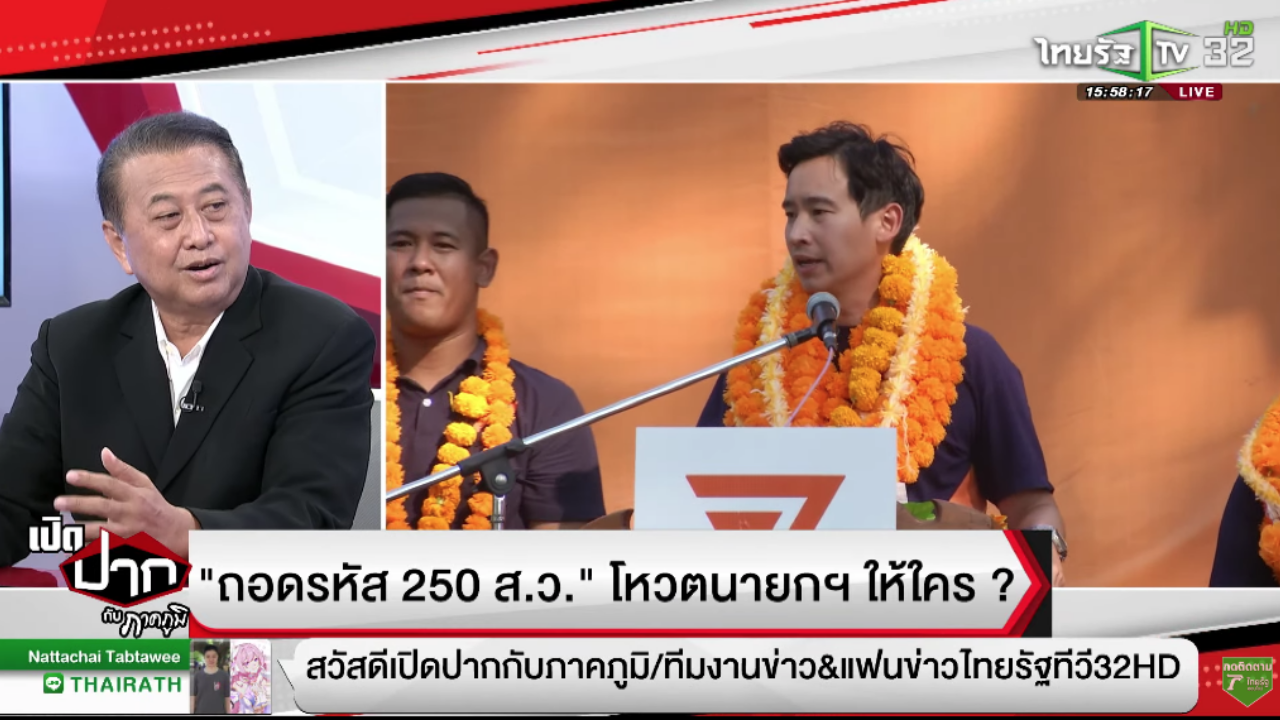 วันที่ 11 เมษายน 2566 ในรายการ "เปิดปากกับภาคภูมิ" ทางไทยรัฐทีวี ช่อง 32 ดำเนินรายการโดย นายภาคภูมิ พันธุ์สถิตย์ ได้พูดคุยกับ คุณวันชัย สอนศิริ และคุณเสรี สุวรรณภานนท์ สมาชิกวุฒิสภา ในประเด็นการเลือกตั้ง 2566