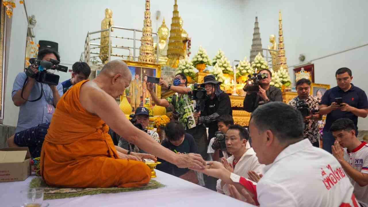 เวลา 11.45 น. คณะของนายเศรษฐา พร้อมด้วย น.ส.ณิชาภา โกวิทานนท์ ผู้สมัคร ส.ส.สมุทรสาคร พรรคเพื่อไทย เบอร์ 8 เดินทางเข้าสักการะหลวงพ่อวัดบ้านแหลม และสิ่งศักดิ์สิทธิ์วัดเพชรสมุทรวรวิหาร (วัดบ้านแหลม) อำเภอเมือง จังหวัดสมุทรสงคราม โดยพระสมุทรวชิรโสภณ เจ้าอาวาสวัดบ้านแหลมได้อวยพรให้ นายเศรษฐา และนายพานทองแท้ว่า “กุศลเจตนาที่จะทำเพื่อประเทศชาติขอให้สำเร็จบรรลุผลตามที่มุ่งมาดปรารถนา” พร้อมกับได้มอบพระเครื่องหลวงพ่อบ้านแหลม แก่ นายเศรษฐา นายพานทองแท้ และผู้สมัคร ส.ส.ของพรรคเพื่อไทยด้วย
