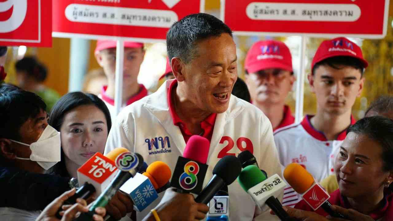 เมื่อเวลา 09.40 น. วันที่ 12 เมษายน 2566 ที่จังหวัดสมุทรสาคร นายเศรษฐา ทวีสิน แคนดิเดตนายกรัฐมนตรีจากพรรคเพื่อไทย และประธานที่ปรึกษาหัวหน้าครอบครัวเพื่อไทย นายพานทองแท้ ชินวัตร ที่ปรึกษาศูนย์ปฏิบัติการเลือกตั้ง ส.ส.พรรคเพื่อไทย นายจักรพงษ์ แสงมณี นายทะเบียนพรรคเพื่อไทย น.ส.ลิณธิภรณ์ วริณวัชรโรจน์ รองเลขาธิการ และรักษาการโฆษกพรรคเพื่อไทย นายอนุสรณ์ ไกรวัตนุสสรณ์ ผู้สมัคร ส.ส.บัญชีรายชื่อพรรคเพื่อไทย พร้อมด้วย นายอุดม กันม่วง ผู้สมัคร ส.ส.เขต 1 พรรคเพื่อไทย เบอร์ 3, นายบุญมี นิลถนอม ผู้สมัคร ส.ส.เขต 2 พรรคเพื่อไทย เบอร์ 3 และนายประยงค์ นอบน้อม ผู้สมัคร ส.ส.เขต 3 พรรคเพื่อไทย เบอร์ 3 ไหว้ศาลเจ้าพ่อหลักเมืองสมุทรสาคร พร้อมสรงน้ำพระเพื่อความเป็นสิริมงคลก่อนเทศกาลสงกรานต์ จากนั้นได้เดินพบปะพ่อค้าแม่ค้าและพี่น้องประชาชนในตลาดมหาชัย โดยนายเศรษฐาได้ฝากพี่น้องประชาชนชาวสมุทรสาครเลือก ส.ส.เขตเบอร์ 3 ทั้งจังหวัด และเลือกพรรคเพื่อไทยเบอร์ 29 ทั้งจังหวัดเช่นกัน