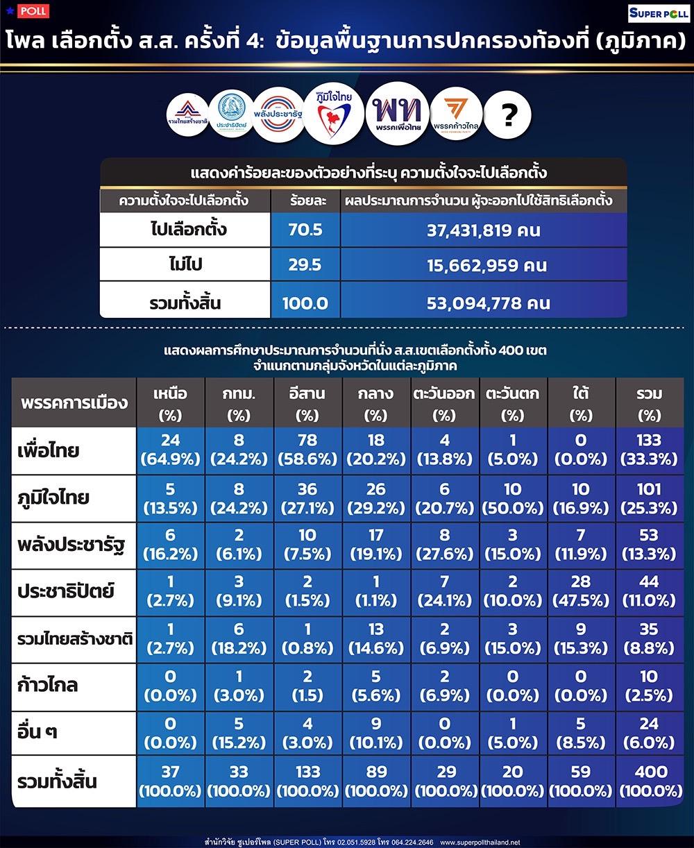 ซูเปอร์โพล เผยผลสำรวจครั้งที่ 4 พบประชาชน 37 ล้านคน จะไปใช้สิทธิ์เลือกตั้ง ด้านความเป็นไปได้ของจำนวนที่นั่ง เพื่อไทยอาจแลนด์สไลด์เหนือ-อีสาน ประชาธิปัตย์กวาดใต้ ภูมิใจไทยได้ ส.ส.แบบกระจาย