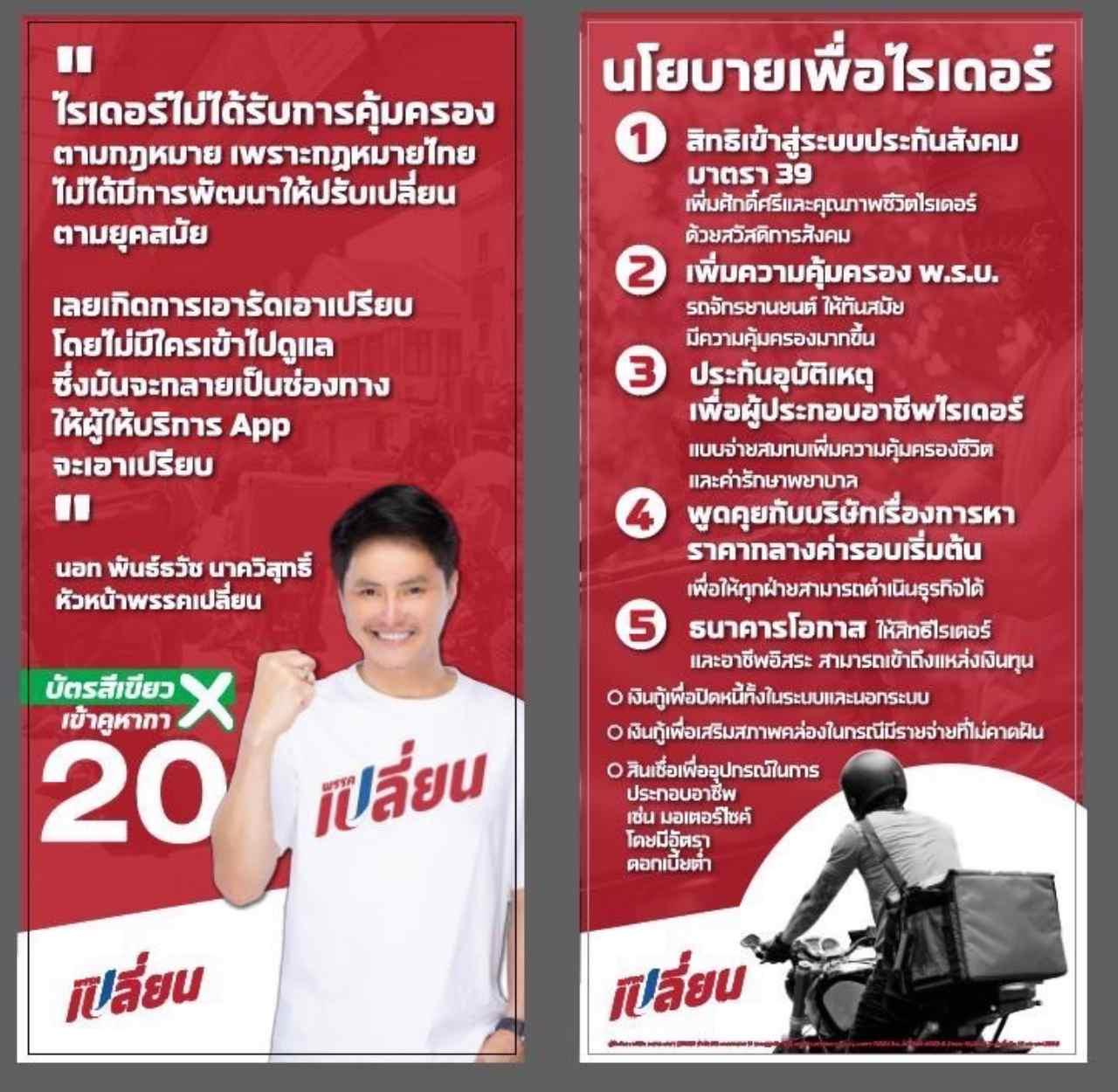 วันที่ 17 เม.ย. นายพันธ์ธวัช นาควิสุทธิ์ หรือ นอท หัวหน้าพรรคเปลี่ยน พร้อมด้วยนายณัฐชนน อาภาศรีรัตน์ โฆษกพรรค kick off เปิดนโยบายไรเดอร์ ซึ่งเป็นนโยบายในการดูแลไรเดอร์ หลังจากที่ได้ร่วมพูดคุยปัญหาต่างๆ ของผู้ขับขี่ไรเดอร์ ก่อนที่จะเปิดนโยบายไรเดอร์อย่างเป็นทางการ ในวันเสาร์ที่ 22 เมษายนนี้ ที่สเตเดียม วัน ในเวลา 20.00 น.