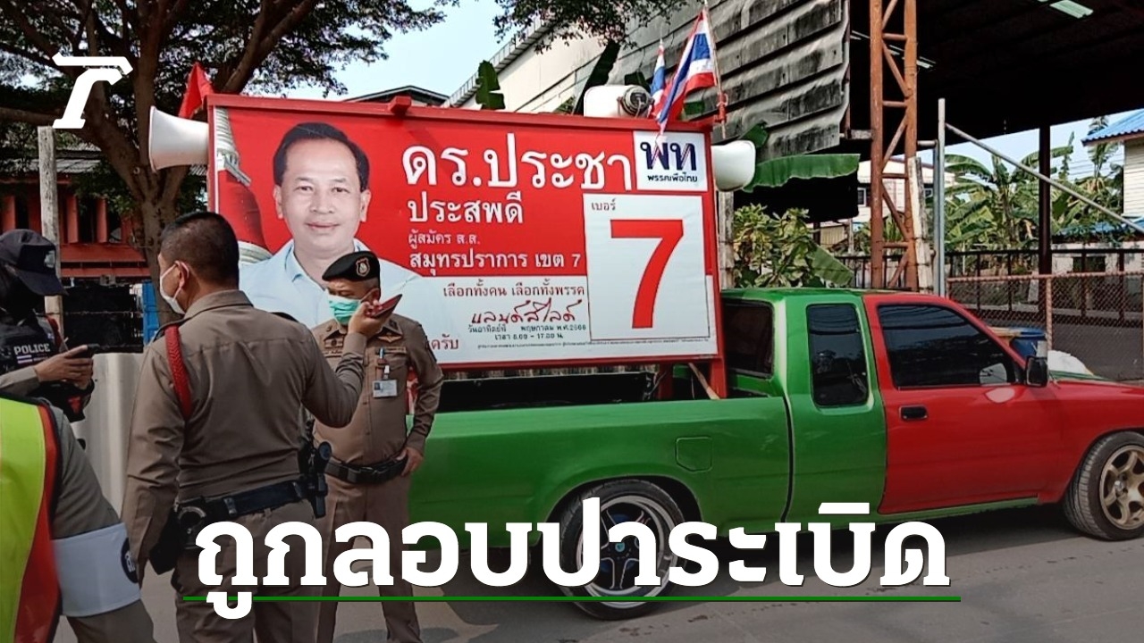 วันที่ 19 เมษายน 2566 ผู้สื่อข่าวรายงานว่าเมื่อเวลา 08.55 น. ดร.ประชา ประสพดี ผู้สมัคร ส.ส.สมุทรปราการ เขต 7 พรรคเพื่อไทย ได้รับแจ้งจากพนักงานขับรถประชาสัมพันธ์หาเสียงว่า ขณะขับรถหาเสียงตระเวนไปบริเวณซอยร่มเย็นนิเวศน์ ได้ยินเสียงคล้ายวัตถุระเบิด ปาเข้ามายังรถหาเสียง จนเกิดเสียงดังสนั่นหวั่นไหวคล้ายพลุ จึงได้หยุดรถ และรีบวิ่งหลบหนียังจุดปลอดภัย ระหว่างนั้นเห็นชายคนหนึ่งวิ่งเข้าไปหลบซ่อนยังบ้านพักหลังหนึ่งในบริเวณนั้น จึงได้แจ้งสถานีตำรวจภูธร (สภ.) พระสมุทรเจดีย์ เพื่อเข้ามาตรวจสอบที่เกิดเหตุและเก็บหลักฐาน เบื้องต้นเจ้าหน้าที่ตำรวจ สภ.พระสมุทรเจดีย์ สามารถจับกุมคนร้ายได้ที่บ้านพัก พร้อมนำตัวไปสอบสวนแล้ว ทราบชื่อบุคคลต้องสงสัยก่อเหตุ ชื่อนายสมชาติ ห้องดอกไม้ อายุ 46 ปี พร้อมเอกสารบัตรประชาชน ใบขับขี่รถยนต์ ใบขับขี่รถจักรยานยนต์ ยารักษาโรค ใบนัดพบแพทย์สถาบันจิตเวชศาสตร์