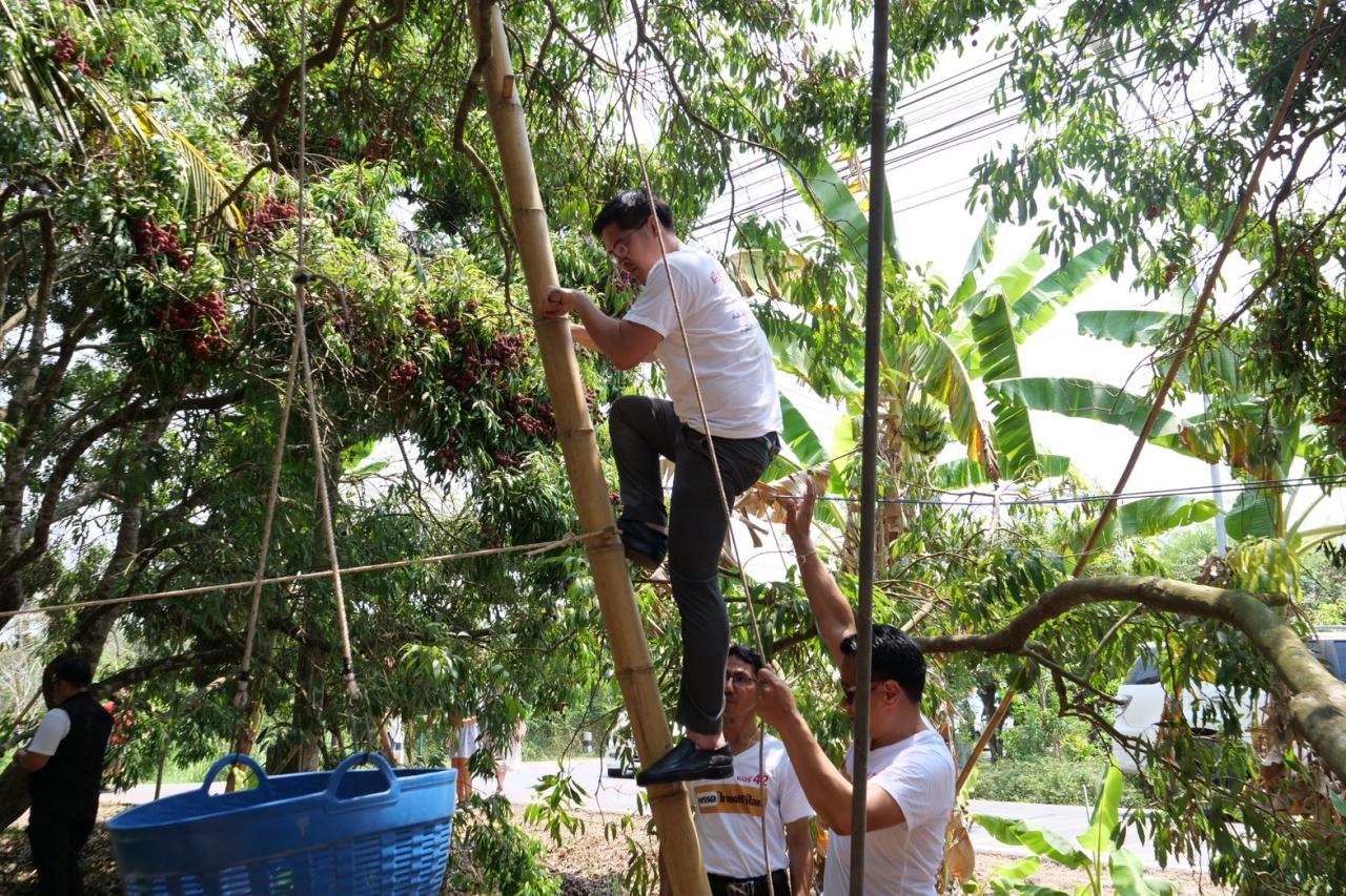 จากนั้น นายมงคลกิตติ์ ไปที่ ต.แควอ้อม แหล่งปลูกลิ้นจี่ที่มีชื่อเสียงของ อ.อัมพวา เมื่อเห็นชาวสวนกำลังปีนพะองขึ้นต้นลิ้นจี่เก็บผลผลิต นายมงคลกิตติ์ ก็ขอลองปีนพะองที่ความสูงประมาณ 6 เมตร ขึ้นไปเก็บลิ้นจี่บ้าง เมื่อลงจากต้นลิ้นจี่ก็ถึงกับเหนื่อยหอบ พร้อมพูดว่า ปกติจะไม่เหนื่อยขนาดนี้ เพราะภาระประเทศไม่เยอะ แต่ปัจจุบันภาระประเทศเยอะ เพราะคนเก่าสร้างไว้เยอะ วันนี้ปีนต้นลิ้นจี่เหนื่อยมาก จากการพบชาวสวนลิ้นจี่ เป็นห่วงชาวสวนที่ 3 ปีที่ผ่านมา ไม่ออกผล เพราะมันเครียดผู้บริหารประเทศ ปีนี้ลิ้นจี่ออกเยอะ เพราะดีใจได้เปลี่ยนผู้บริหารประเทศ