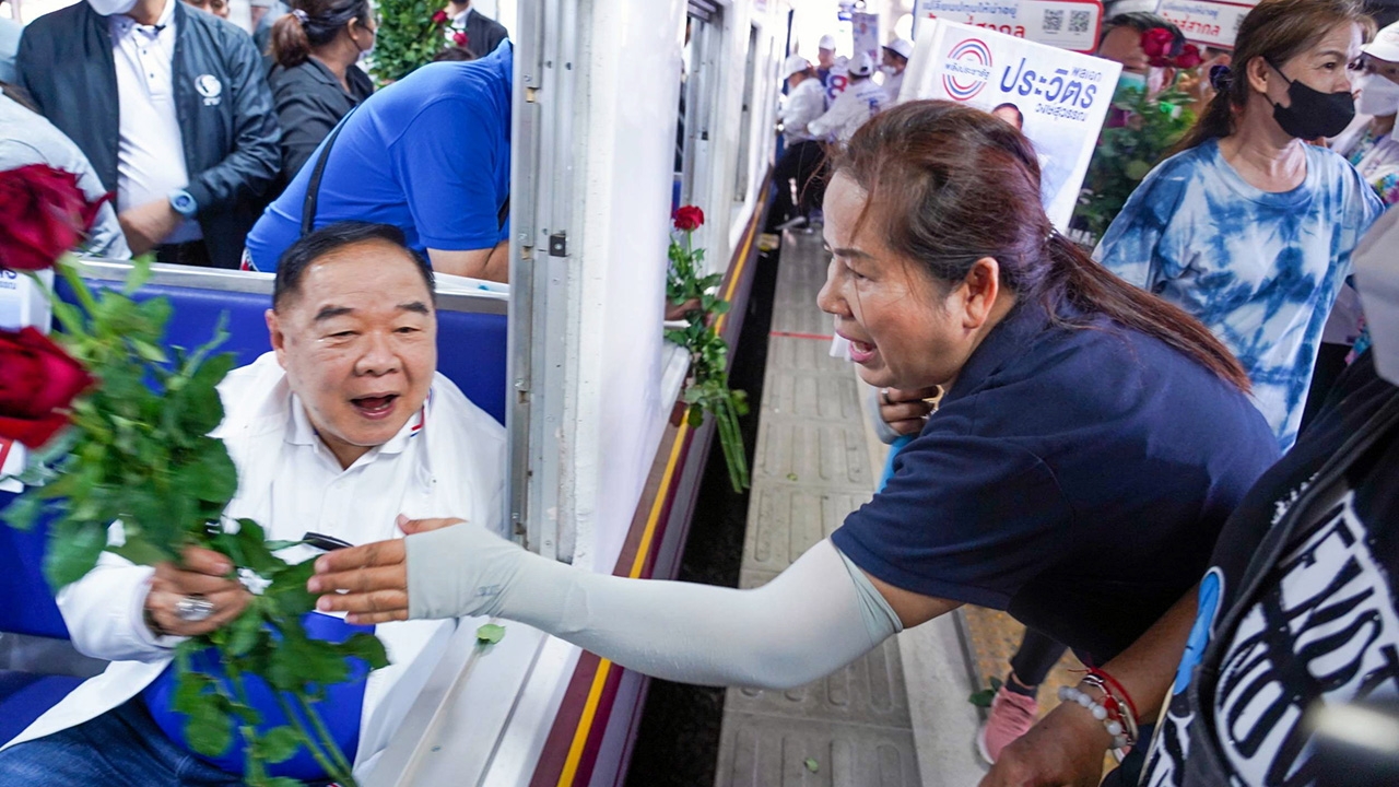 พล.อ.ประวิตร วงษ์สุวรรณ หัวหน้าพรรคพลังประชารัฐ รับดอกกุหลาบจากกองเชียร์ที่มารอให้กำลังใจตามสถานีรายทาง ระหว่างนั่งจากกรุงเทพฯไปร่วมปราศรัยใหญ่ที่ จ.นครราชสีมา ขอปักธงเป็นอันดับ 1 ในภาคอีสาน.