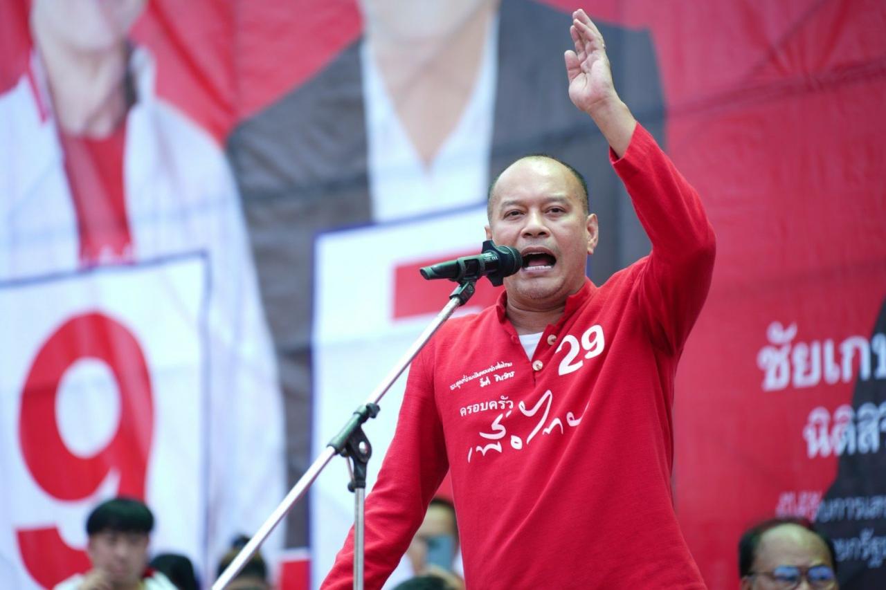 “คราวที่แล้วที่มีคนหลุดไปเป็นงูเห่าเพราะผมไม่อยู่ เขาเอาผมไปขังไว้ แต่วันนี้ผมออกมาแล้ว ถ้าพี่น้องเลือก ส.ส.ของพรรคเพื่อไทย ทั้ง 9 เขต ผมจะเอาเชือกกล้วยมัดขาไว้ แล้วหากเข้าไปในสภาฯ แล้วเข้าไปดูดกัญชา ผมจะตามไปเช็กบิลเอง นักการเมืองต้องเคารพและซื่อตรงต่อคะแนนเสียงของพี่น้องประชาชน วันนี้ผมลงสมัคร ส.ส. ก็ไม่ได้ เป็นรัฐมนตรีก็ไม่ได้ ถูกตัดสิทธิ แต่ที่ผ่านมาผมเป็นคนที่สู้กับประยุทธ์และประวิตรมา เป็นอย่างไรก็เป็นอย่างนั้นตลอดไป แม้ผมเป็นอะไรไม่ได้ แต่ที่มายืนวันนี้เพราะมีภาระหน้าที่ เรากับพี่น้องประชาชนต่อสู้ร่วมอุดมการณ์กันมา กอดคอกันมา พูดประโยคเดียวกันว่าเราไม่เอาเผด็จการ เราจะต้องชนะเผด็จการให้ได้ และผมมายืนตรงนี้เพราะมั่นใจว่าพรรคเพื่อไทยเป็นพรรคที่ยืนยันประชาธิปไตย ไม่ร่วมงานกับเผด็จการ เชื่อว่าเพื่อไทยเป็นพรรคเดียวที่เอาชนะได้ เป็นพรรคเดียวที่แก้ปัญหาได้ และเป็นพรรคเดียวที่มีผลงานอยู่ในใจประชาชนตลอดมา ดังนั้น สู้ด้วยกันเที่ยวนี้ไม่เสี่ยงคุก ไม่เสี่ยงตะราง ไม่เสี่ยงถูกเขาไล่ยิงไล่ฆ่า แค่เข้าคูหากาเพื่อไทยทั้ง 2 ใบ ชนะ ปลอดภัย ได้เงิน 10,000”