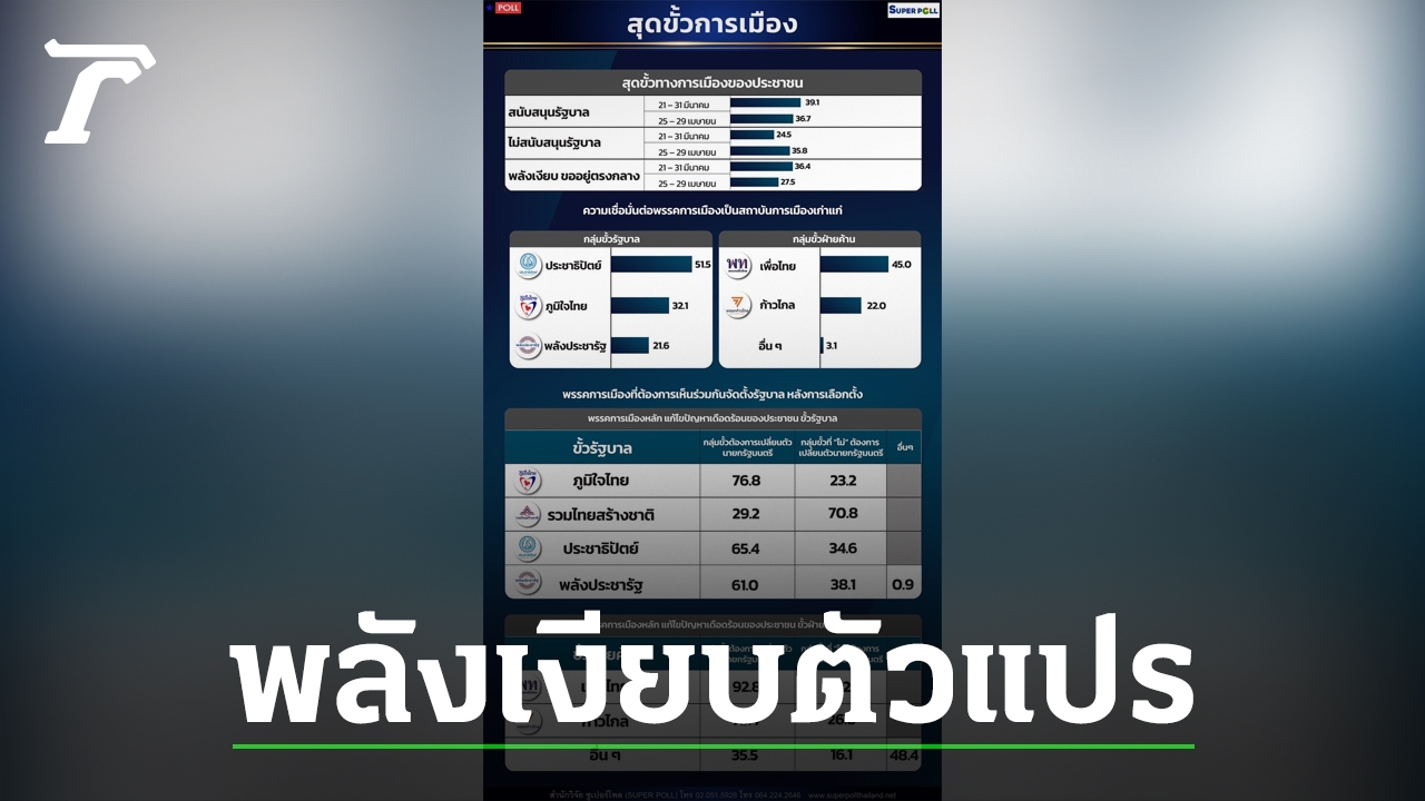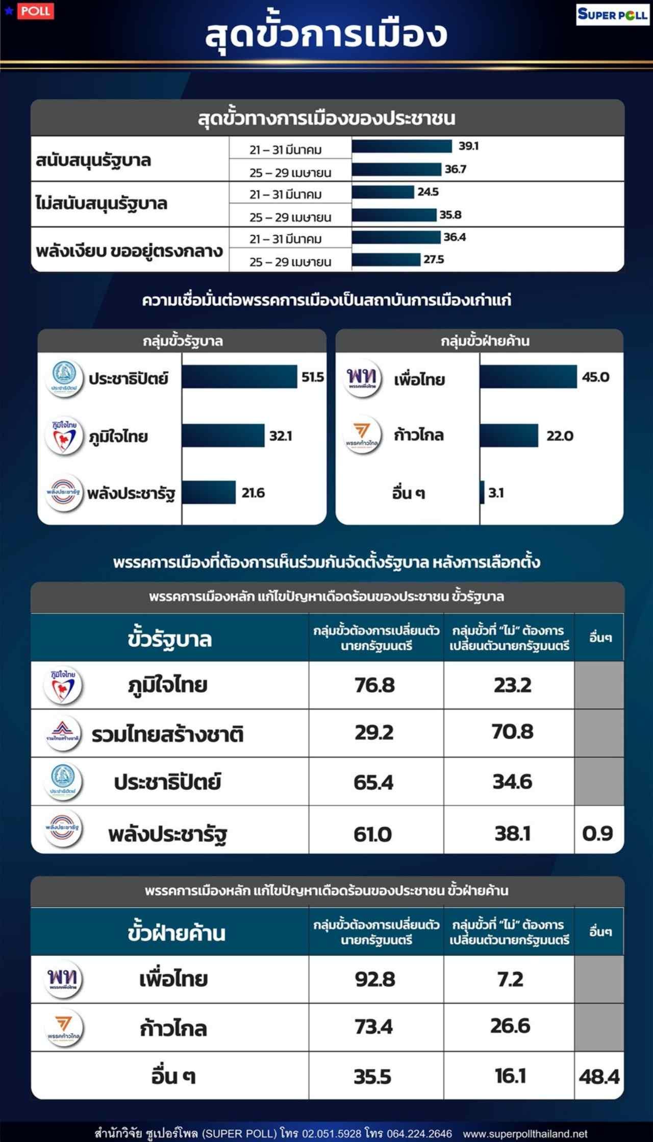 วันที่ 30 เม.ย. 66 สำนักวิจัยซูเปอร์โพล (SUPER POLL) เสนอผลสำรวจ เรื่อง “สุดขั้วการเมือง” กรณีศึกษาตัวอย่างประชาชนผู้มีสิทธิเลือกตั้งทุกสาขาอาชีพทั่วประเทศอายุ 18 ปีขึ้นไป ดำเนินโครงการระหว่างวันที่ 25–29 เมษายน พ.ศ. 2566 โดยผลสำรวจพบแนวโน้มของกลุ่มพลังเงียบขออยู่ตรงกลาง เริ่มกระจายตัวออกไปยังขั้วการเมืองต่างๆ อย่างมีนัยสำคัญทางสถิติคือ จากร้อยละ 36.4 ในช่วงปลายเดือนมีนาคม ลดลงเหลือร้อยละ 27.5 ในช่วงปลายเดือนเมษายน และพบว่าได้กระจายตัวฐานสนับสนุนไปยังขั้วการเมืองที่ไม่สนับสนุนรัฐบาลมากกว่า คือ จากร้อยละ 24.5 ในช่วงปลายเดือนมีนาคม เพิ่มขึ้นเป็นร้อยละ 35.8 ที่ไม่สนับสนุนรัฐบาลในช่วงปลายเดือนเมษายน โดยฐานสนับสนุนรัฐบาลลดลงจากร้อยละ 39.1 ในช่วงปลายเดือนมีนาคม ลงมาอยู่ที่ร้อยละ 36.7 ในการสำรวจล่าสุด