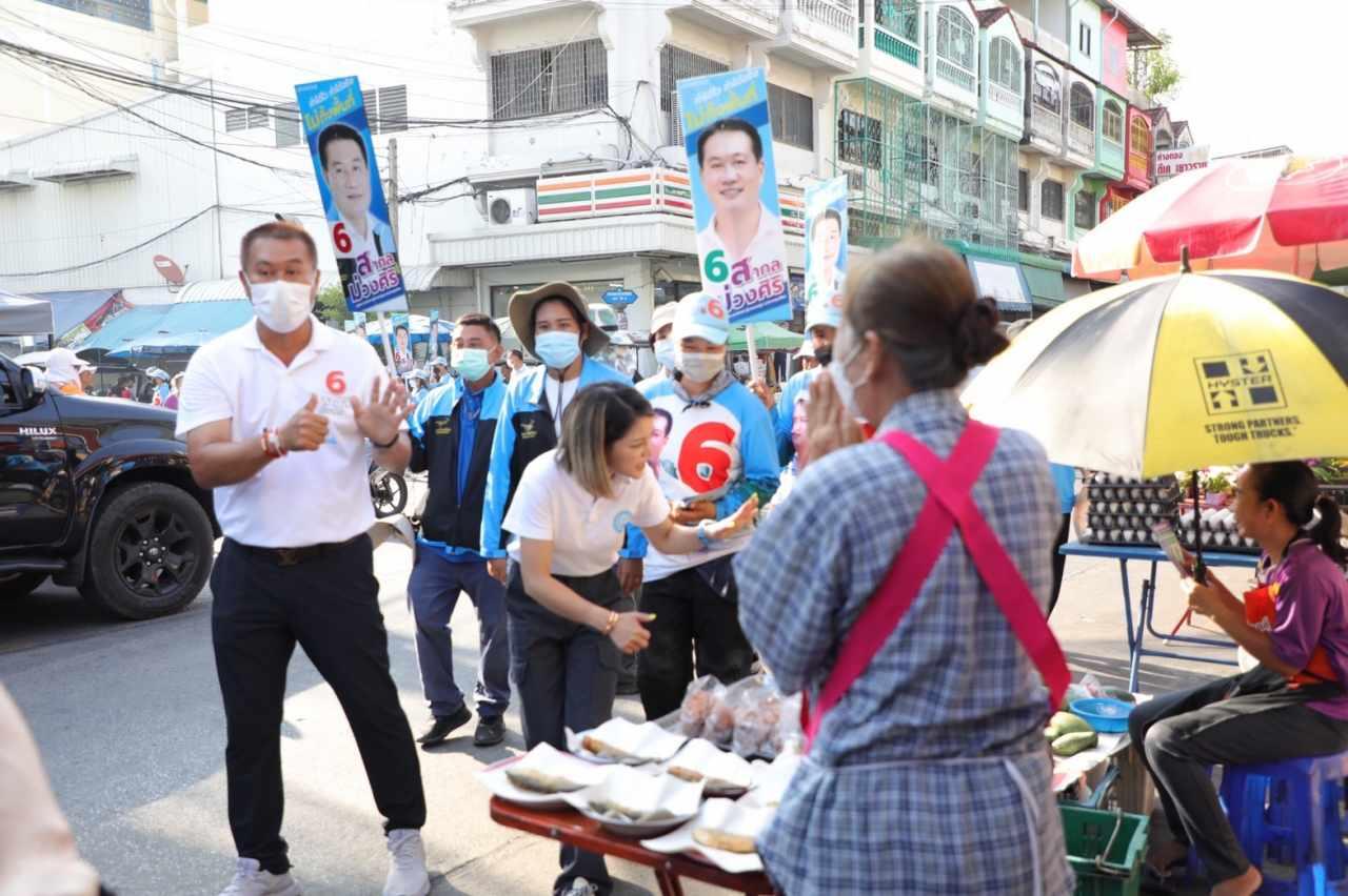 วันที่ 6 พ.ค. 2566 น.ส.วทันยา บุนนาค ประธานคณะทำงานนวัตกรรมการเมือง พรรคประชาธิปัตย์ (ปชป.) ร่วมลงพื้นที่ตลาดเช้าที่หมู่บ้านพระปิ่น 5 และตลาดเช้าหมู่บ้าน ดี.เค. เขตบางบอนเพื่อขอเสียงสนับสนุนให้นายสากล ม่วงศิริ ผู้สมัคร ส.ส. กทม. เขตเลือกตั้ง 27 บางบอน-บางขุนเทียน เบอร์ 6 พรรค ปชป. โดยนายสากล กล่าวว่า ตนมั่นใจว่ามีกระแสตอบรับจากประชาชนดี ในช่วง 8 ปีที่ผ่านมา ที่ไม่มี ส.ส. ไม่มีการเมืองท้องถิ่น ตนได้ทำงานการเมืองมาต่อเนื่องดูแลพี่น้องประชาชนมาตลอด โดยเฉพาะช่วงสถานการณ์โควิด-19 ได้ลงพื้นที่ช่วยเหลือด้วยสโลแกนที่ว่า “เป็นคนพื้นที่ ไม่ทิ้งพื้นที่” จึงขอฝากพี่น้องประชาชนเขตบางบอน-บางขุนเทียน พิจารณาว่าตนเป็นคนในพื้นที่ ทำงานการเมืองมาต่อเนื่องตั้งแต่รุ่นพ่อทีมงานม่วงศิริทุกคนได้ดูแลพี่น้องประชาชนมาตลอดเชื่อว่าในการเลือกตั้งครั้งนี้พี่น้องประชาชนทั้งในเขตบางบอนและบางขุนเทียนจะให้ความเมตตาเลือกตนไปทำงาน ทั้งนี้ตนเชื่อมั่นในพลังเงียบอีกจำนวนมาก แม้ผลโพลจะระบุว่าพรรคคู่แข่ง ส.ส.คนเดิม จะกระแสดีก็ตาม แต่ตัวบุคคลที่ทำงานจริงจะเป็นสิ่งหนึ่งที่ประชาชนตอบรับ
