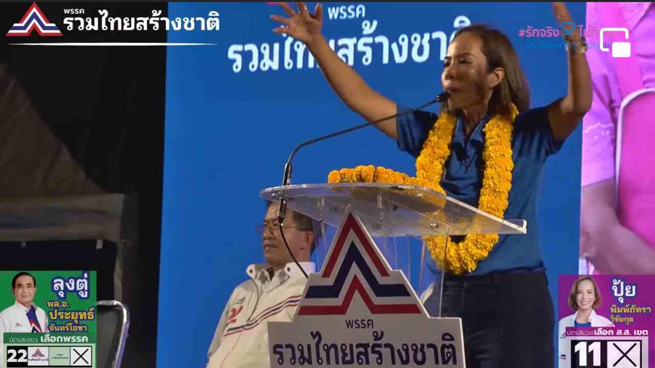 โดยมีบางช่วงบางตอนบนเวทีมีใจความสำคัญว่า “เป็นผู้แทนช่วยเหลือคนพื้นที่ ยืนอยู่อย่างมีศักดิ์ศรี ไม่ให้ใครมากดขี่ข่มเหง แต่เมื่อใดที่กลายเป็นลูกไล่ ลูกน้อง กลายเป็นกลไกเพื่อขับเคลื่อนผู้มีอิทธิพลบางกลุ่มบางพวกภายในพรรค จะให้อยู่ต่อได้อย่างไร แต่คนในพรรคเมื่อเราออกมาแล้วกลับว่าร้ายไม่ดีสักอย่าง ดีแต่พูดให้ร้าย กลับกันคนที่ย้ายมาจากพรรคอื่นมาอยู่เห็นเขาดีทุกอย่าง อดทนไม่พูดเรื่องนี้ เพราะถือว่าเป็นคนมีมารยาท และเป็นคนสำนึกในบุญคุณตลอด แต่สิ่งที่ตนได้รับคือถูกรุม ปุ้ยคนเดียวไม่พอ ทั้งทีมงานยังถูกคนโทรศัพท์มาข่มขู่คุกคามตลอด นี่จึงเป็นเหตุผลที่มาอยู่พรรครวมไทยสร้างชาติ ที่อยู่อย่างมีศักดิ์ศรี เราอยู่กันแบบพี่น้อง ไม่ข่มเหงใคร พร้อมยืนยันว่าจะมุ่งมั่นในการรณรงค์หาเสียงต่อไป”