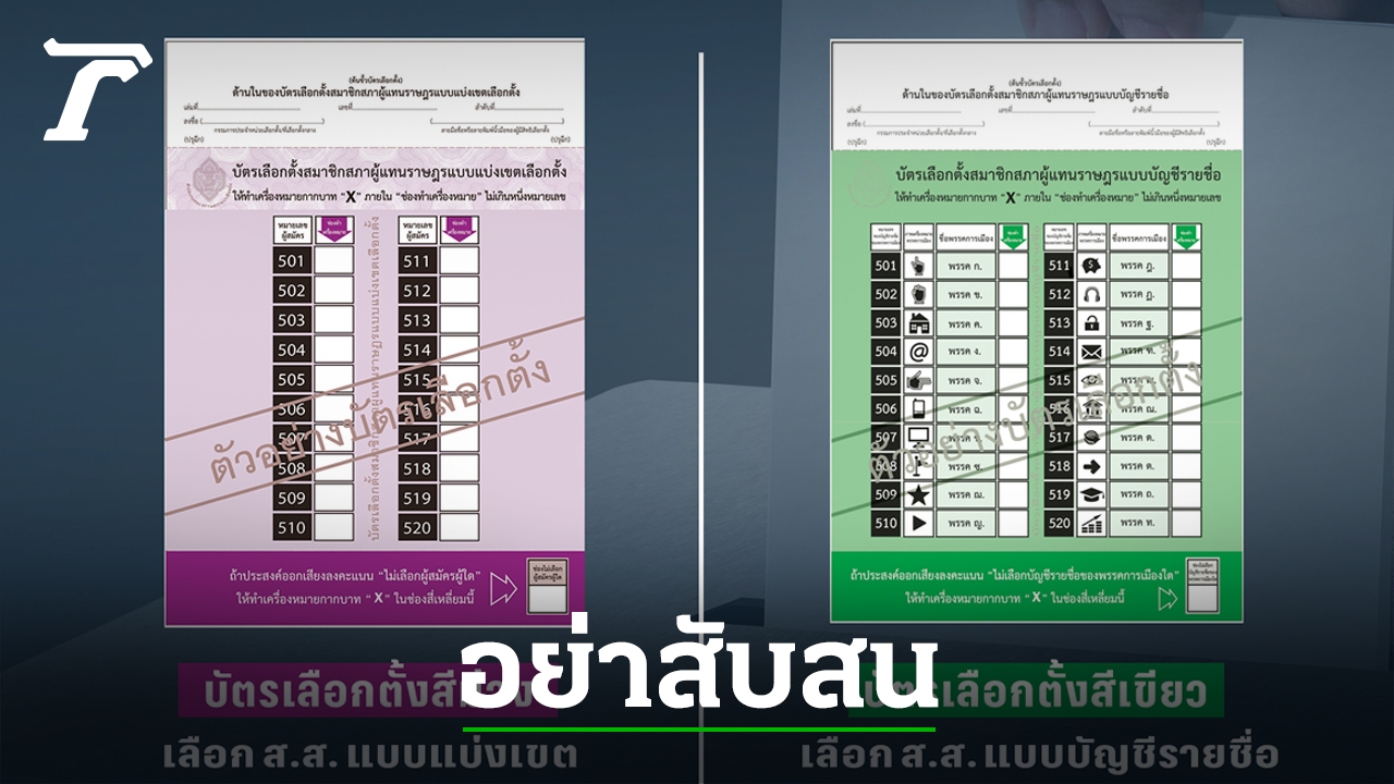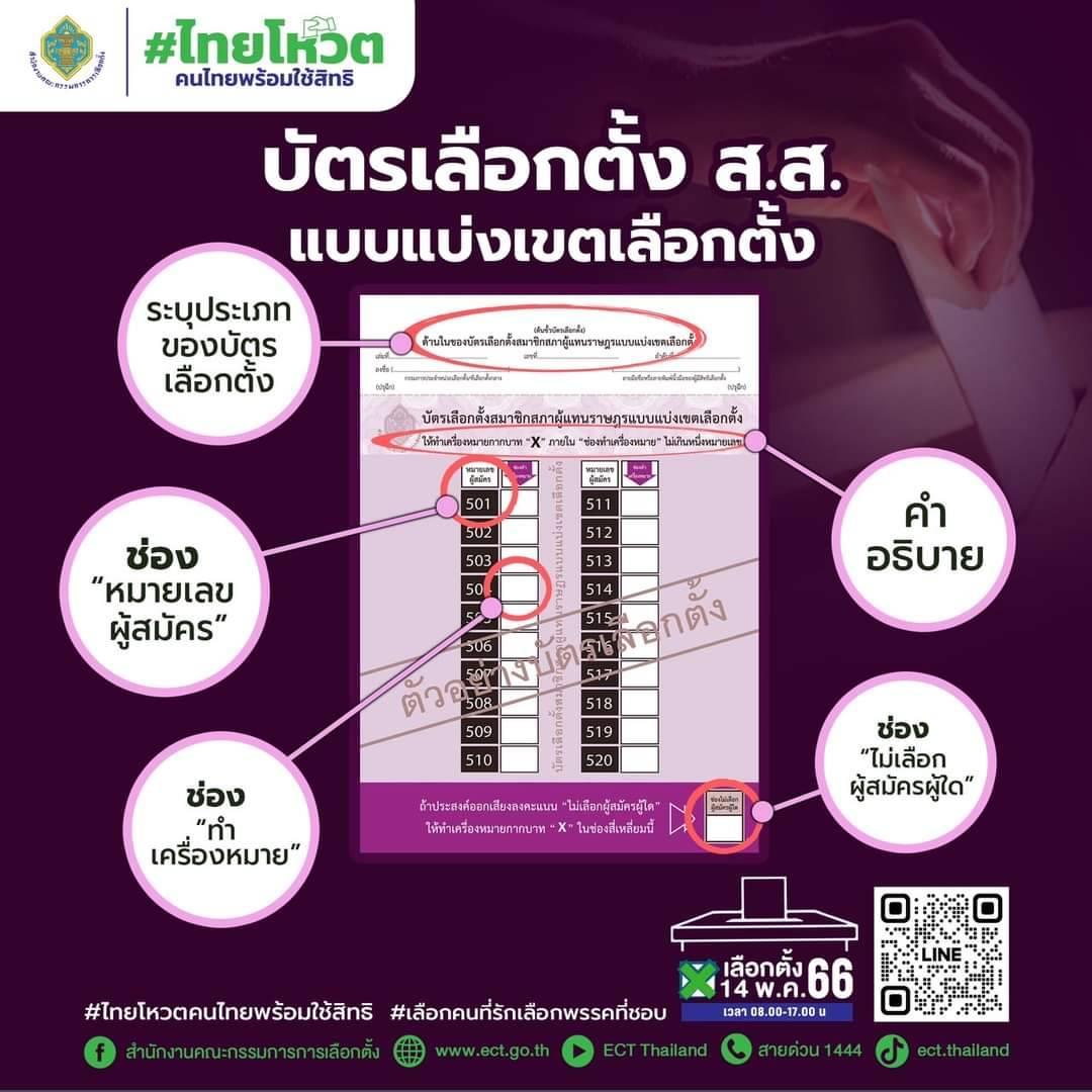 สำหรับบัตรเลือกตั้ง 2 ใบ ดูง่ายๆ และจำให้ขึ้นใจ ก่อนเข้าคูหา สำหรับบัตรเลือกตั้ง ส.ส.แบบแบ่งเขตเลือกตั้ง ใช้ (สีม่วง) มีหมายเลขผู้สมัคร และ ช่องสำหรับกากบาท โดยไม่มีชื่อผู้สมัครและโลโก้พรรค