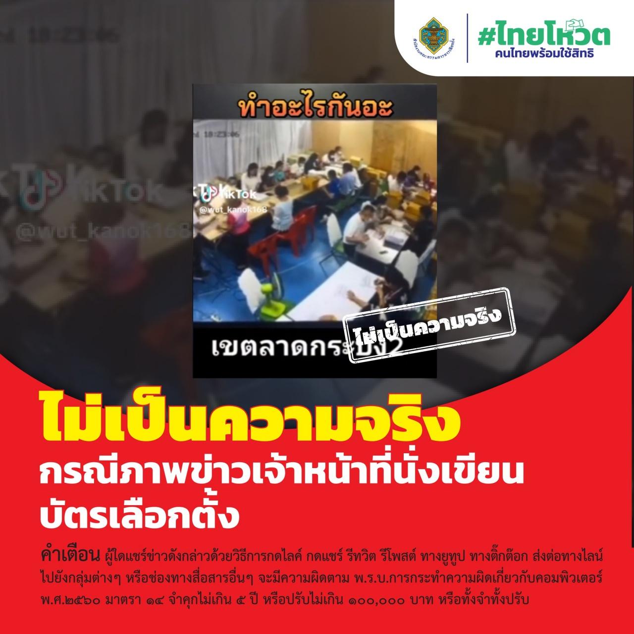 นอกจากนี้ กกต. ยังชี้แจง กรณีภาพข่าวและคลิปวิดีโอ เจ้าหน้าที่ประจำหน่วยเลือกตั้งได้นำบัตรเลือกตั้งมาทำเครื่องหมายกากบาทลงในบัตรเลือกตั้งตามที่มีการเผยแพร่ให้ประชาชนเกิดความเข้าใจผิด โดยมีข้อความตามคลิปวิดีโอสงสัยว่า “พวกคุณ กาก x อะไรกัน เขตลาดกระบัง 2” นั้น ระบุว่าภาพข่าวและคลิปวิดีโอที่นำมาเผยแพร่เป็นการปฏิบัติหน้าที่ของคณะกรรมการการเลือกตั้งประจำเขตเลือกตั้ง ที่จะต้องลงนามหน้าปกเล่มบัตรเลือกตั้งก่อนส่งมอบให้กับ กปน. โดยจะปรากฏภาพการปฏิบัติงานของคณะกรรมการการเลือกตั้งประจำเขตเลือกตั้งในทุกเขต ก่อนที่จะนำส่งบัตรเลือกตั้งให้แก่ กปน. ในวันเสาร์ที่ 13 พฤษภาคม 2566 ที่เป็นไปตาม ระเบียบคณะกรรมการการเลือกตั้งว่าด้วยการเลือกตั้งสมาชิกสภาผู้แทนราษฎร พ.ศ. 2566 ข้อ 140 ถึง ข้อ 142