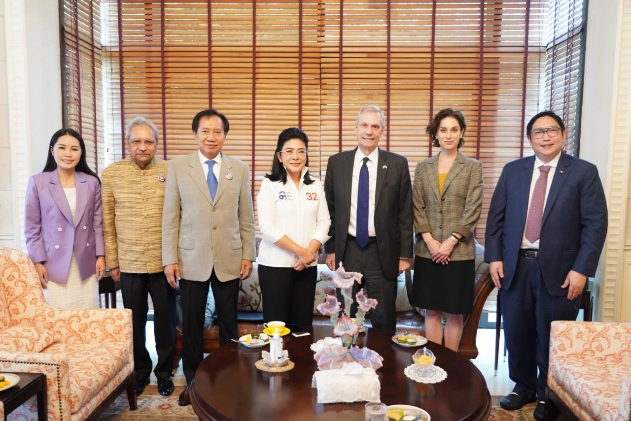 ขณะเดียวกันวันนี้ นายโรเบิร์ต เอฟ. โกเดค (Robert F. Godec) เอกอัครราชทูตสหรัฐอเมริกาประจำประเทศไทย พร้อมคณะ เข้าพบพรรคไทยสร้างไทย เพื่อหารือเรื่องนโยบายด้านต่างประเทศและแลกเปลี่ยนมุมมองการพัฒนาประเทศร่วมกัน ในช่วงโค้งสุดท้ายของการเลือกตั้ง ซึ่งพรรคไทยสร้างไทยได้ชี้แจงนโยบายต่างๆ และยังตั้งเป้าภายในปีแรกว่าจะผลักดันให้มีการแก้ไขรัฐธรรมนูญเพื่อให้เป็นรัฐธรรมนูญฉบับประชาชนอย่างแท้จริง มีการยื่นเสนอร่างรัฐธรรมนูญฉบับประชาชนเพื่อคืนอำนาจให้ประชาชน โดยให้มีสมาชิกสภาร่างรัฐธรรมนูญ (ส.ส.ร.) จากประชาชน ยุติวงจรความขัดแย้งการเมือง 2 ฝ่าย อีกทั้งเน้นเรื่องเสรีภาพ ความเสมอภาค และภราดรภาพ ส่งเสริมการสร้าง การแบ่งปันกันระหว่างเพื่อนมนุษย์ ไม่สนับสนุนสงครามในทุกมิติ ยึดหลักการอยู่ร่วมกันอย่างสันติ