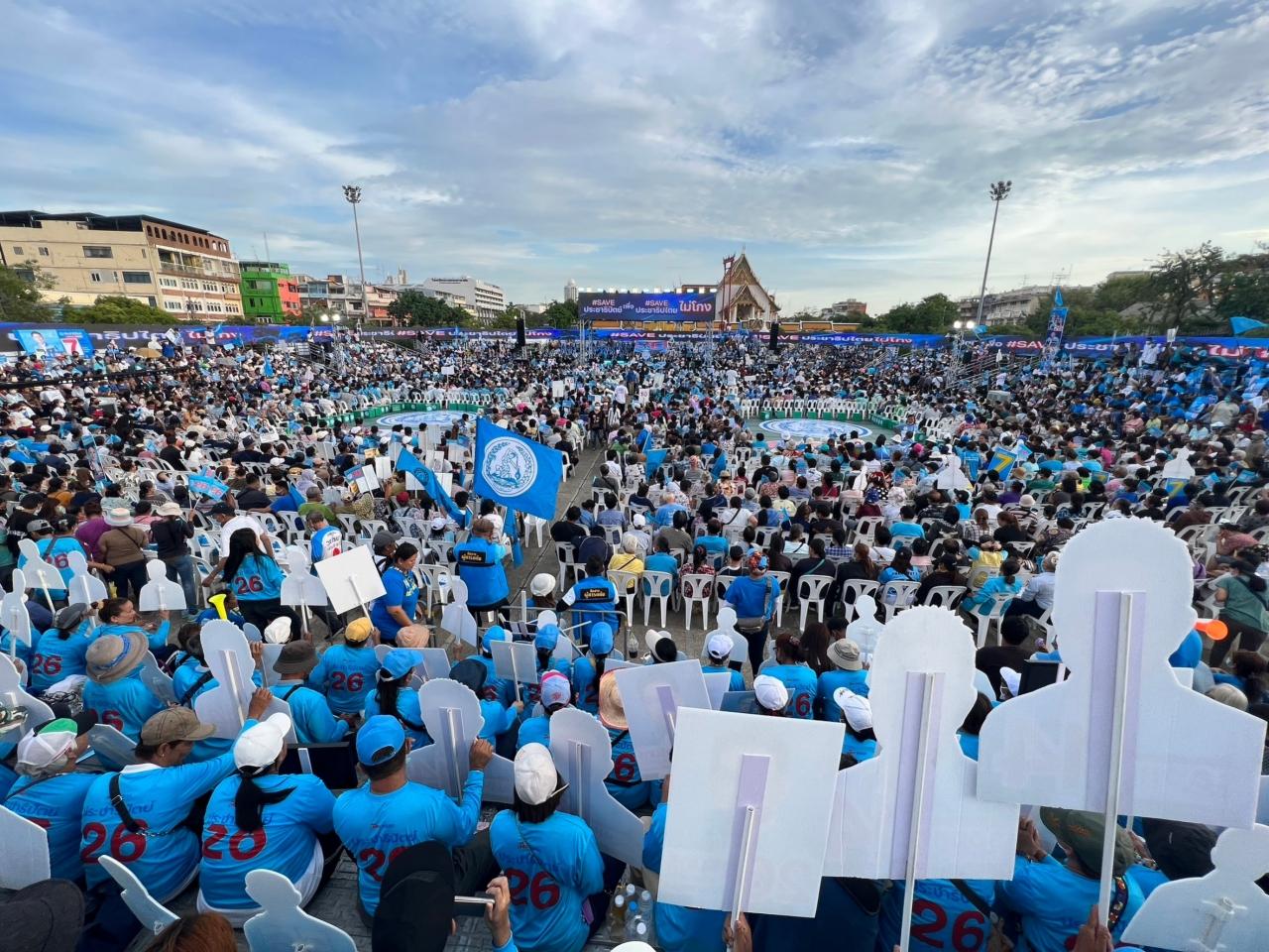 เมื่อเวลา 17.30 น. วันที่ 12 พ.ค. 2566 ที่ลานคนเมือง ศาลาว่าการกรุงเทพมหานคร (กทม.) พรรคประชาธิปัตย์ (ปชป.) จัดเวทีปราศรัยใหญ่ปิดท้ายการรณรงค์หาเสียงเลือกตั้งทั่วไปปี 2566 โดยจัดเวทีปราศรัยเป็นที่นั่งอัฒจันทร์เป็นอักษรตัวโอ มีเวทีหันหน้ามาด้านหน้าศาลาว่าการ กทม. เปิดเวทีโดย นายจุรินทร์ ลักษณวิศิษฏ์ หัวหน้าพรรคประชาธิปัตย์ ที่กล่าวตอนหนึ่งว่า การเลือกตั้งครั้งนี้ แข่งขันรุนแรงทั้งคนทั้งนโยบาย มีการสร้างกระแสทางการเมืองให้เข้าใจว่าจะมีแลนด์สไลด์ได้ ที่สำคัญและน่าห่วงมากคือ ฝุ่น PM 2.5 วันนี้ที่หายไปจาก กทม. แต่กลับมี PM 500 กับ PM 1,500 จึงขอฝากไปถึงพี่น้องประชาชนว่าอย่าเลือกตามกระแส แต่ขอให้เลือกอนาคตที่ยั่งยืนเพื่ออนาคตกรุงเทพมหานครและประเทศไทยของเรา