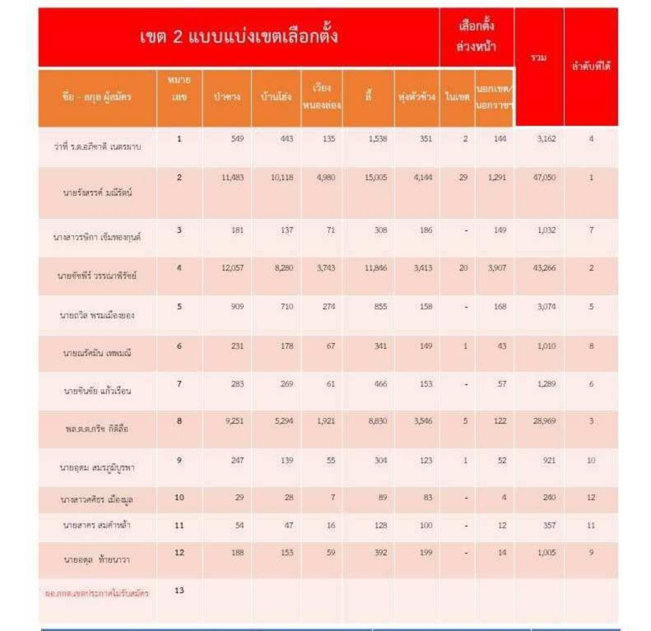 ขณะที่ เขต 2 อันดับ 1 ผู้สมัครหมายเลข 2 นายรังสรรค์ มณีรัตน์ จากพรรคเพื่อไทย คะแนน 47,050 คะแนน โดยถือเป็น อดีต ส.ส.ที่ยังสามารถรักษาแชมป์เอาไว้ได้อีก 1 สมัย แต่การเลือกตั้งครั้งนี้นับว่า พรรคก้าวไกลมาแรงสุดๆ อย่างไม่คาดฝัน เพราะ นายชัชพีร์ วรรณาพิรัชย์ จากพรรคก้าวไกลเกือบพลิกล็อกเอาชนะได้ ถือว่าเป็นน้องใหม่ในวงการเมืองที่น่าจับตาอีกคนหนึ่ง.
