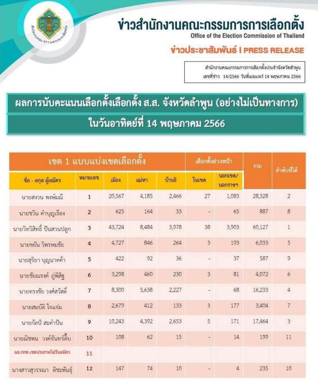 ผลการนับคะแนนเลือกตั้ง ส.ส.แบบไม่เป็นทางการ จ.ลำพูน เขต 1 "วิทวิสิทธิ์" ผู้สมัครพรรคก้าวไกล เอาชนะแชมป์เก่า อดีต ส.ส.เพื่อไทยไปได้ ขณะที่เขต 2 "รังสรรค์" แชมป์เก่าเพื่อไทยรักษาเก้าอี้ไว้ได้