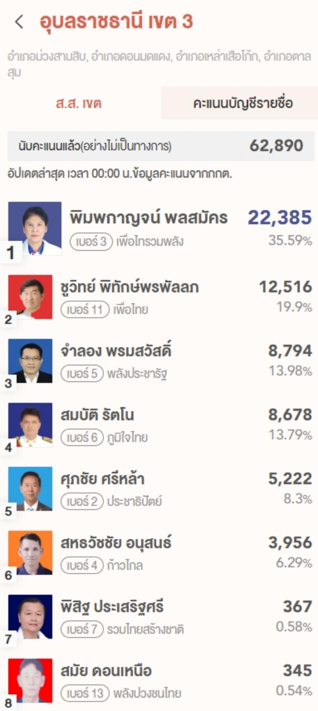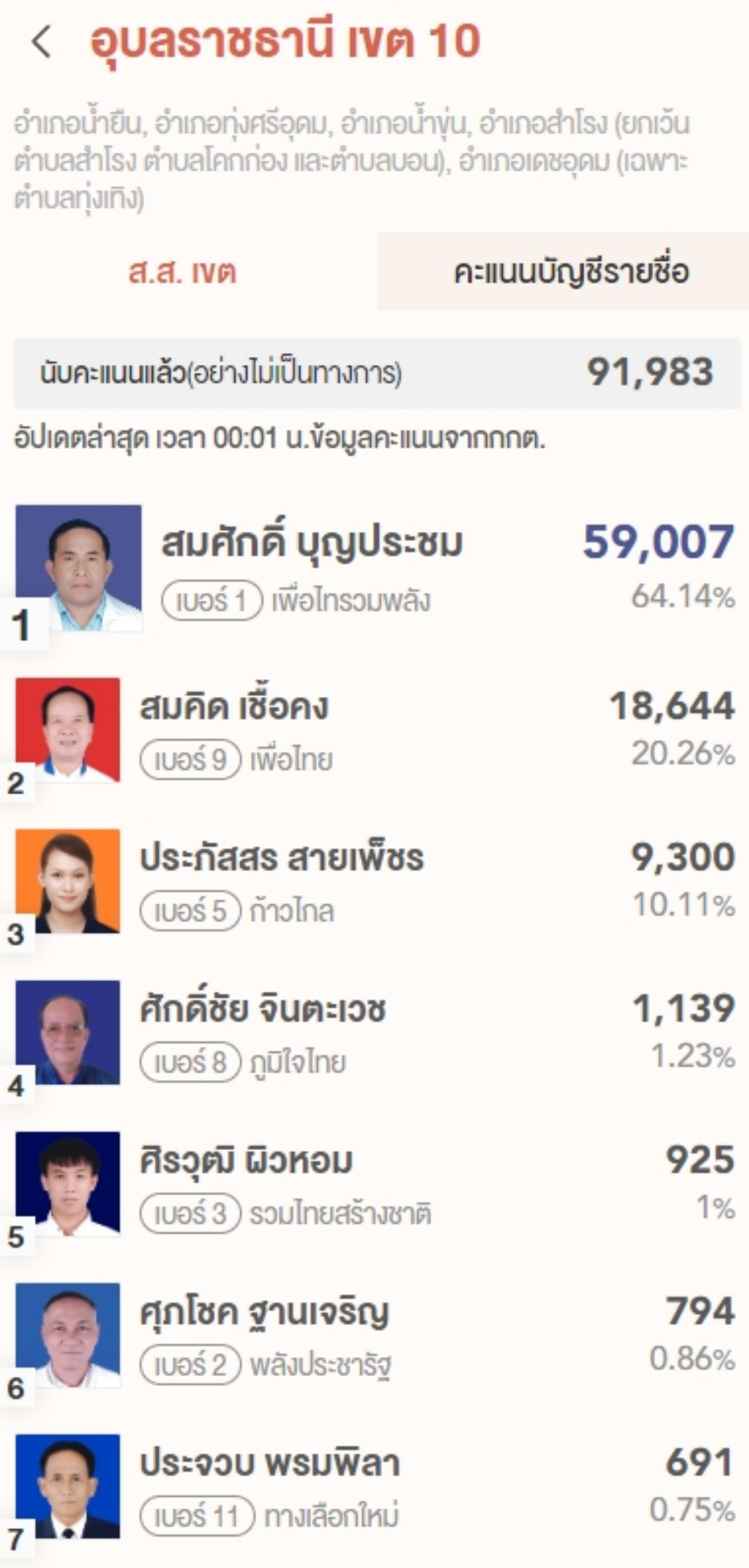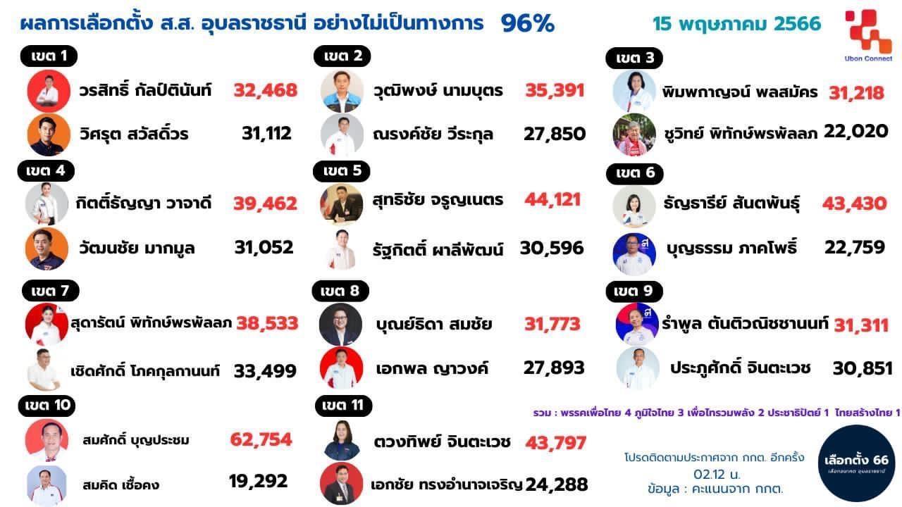 สรุปจังหวัดอุบลราชธานี จาก 11 ที่นั่ง เพื่อไทยได้ผู้สมัครไป 4 เขต พรรคภูมิใจไทยได้ 3 ที่นั่ง พรรคเพื่อไทรวมพลังได้ 2 ที่นั่ง ประชาธิปัตย์ 1 ที่นั่ง ไทยสร้างไทย 1 ที่นั่ง