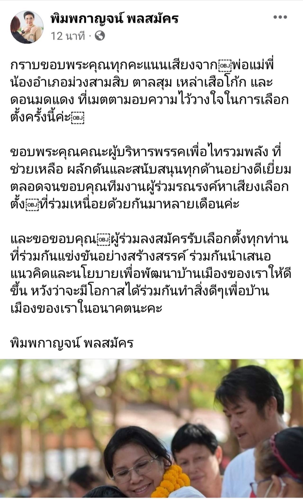 สำหรับนางพิมพกาญจน์ พลสมัคร หรือ สจ.หน่อย อดีตประธานสภาองค์การบริหารส่วนจังหวัดอุบลราชธานีโพสต์ผ่านเฟซบุ๊กส่วนตัว ว่า "กราบขอบพระคุณทุกคะแนนเสียงจากพ่อแม่พี่น้องอำเภอม่วงสามสิบ ตาลสุม เหล่าเสือโก้ก และดอนมดแดง ที่เมตตามอบความไว้วางใจในการเลือกตั้งครั้งนี้ค่ะ