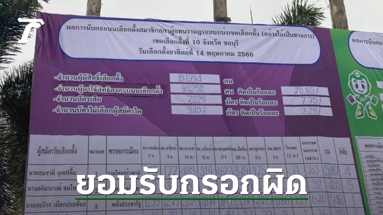 คณะกรรมการการเลือกตั้ง รับเจ้าหน้าที่กรอกข้อมูลเลือกตั้ง ส.ส.ชลบุรี เขต 10 ผิด แต่แก้แล้วหลังถูกทักท้วง พร้อมแจงบัตรเสียมีเพียง 2,234 บัตรเท่านั้น ไม่ใช่ 7,229 บัตร ตามที่เป็นข่าว