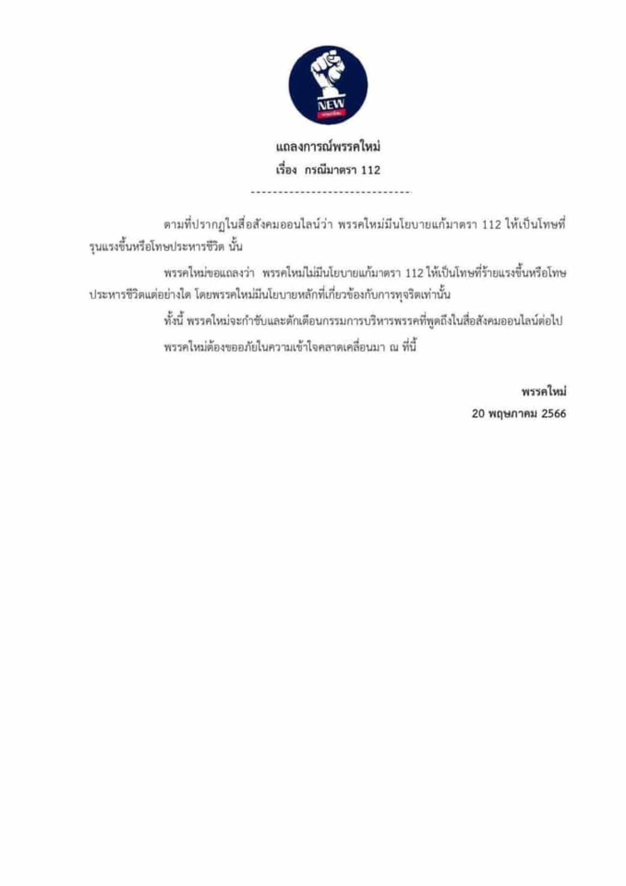 วันที่ 20 พฤษภาคม 2566 พรรคใหม่ ได้โพสต์เฟซบุ๊ก ถึงแถลงการณ์พรรคใหม่ เรื่อง กรณีมาตรา 112 ระบุว่า ตามที่ปรากฏในสื่อสังคมออนไลน์ว่า พรรคใหม่มีนโยบายแก้มาตรา 112 ให้เป็นโทษที่รุนแรงขึ้นหรือโทษประหารชีวิตนั้น