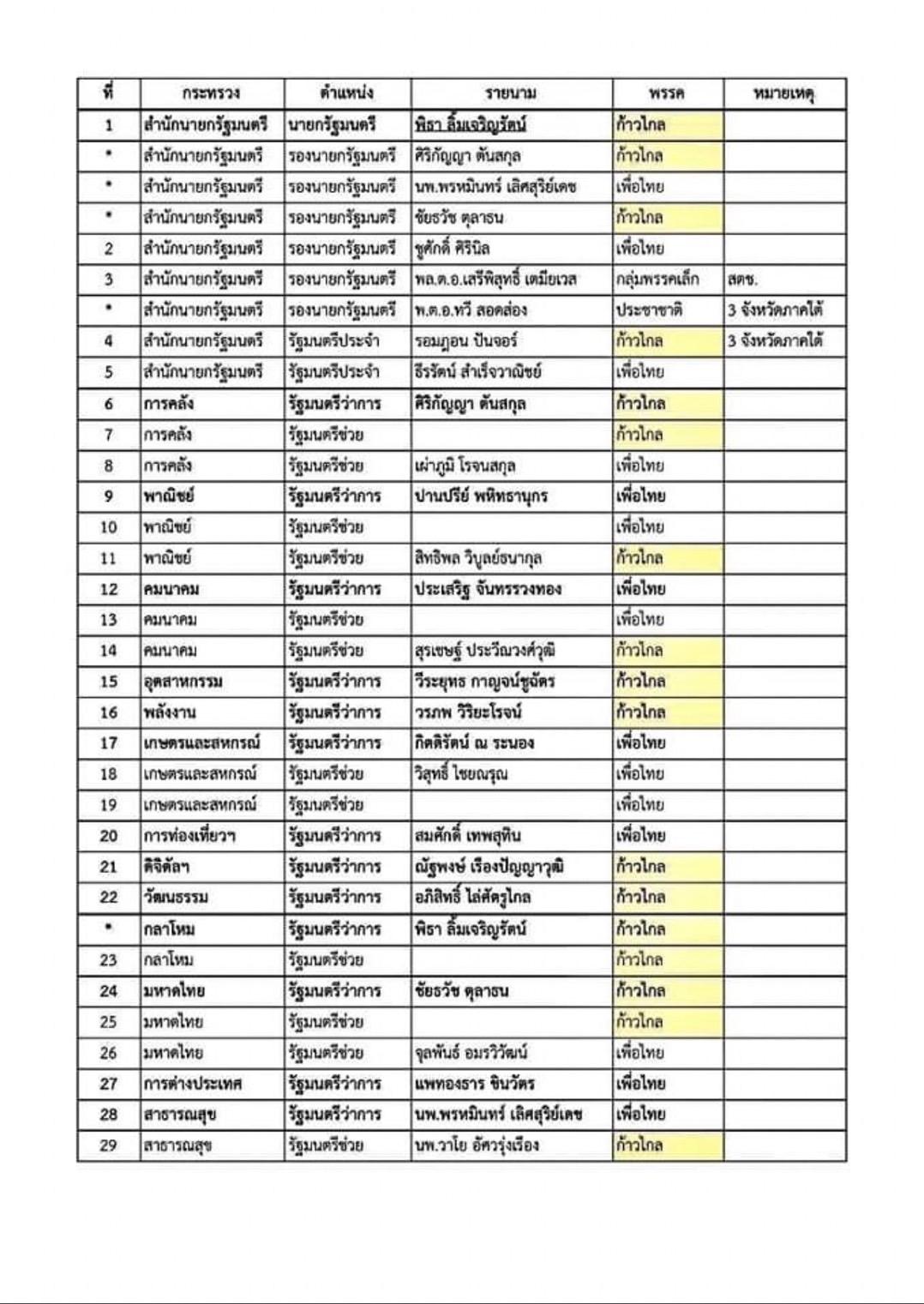 โซเชียลมีเดียแชร์กันว่อน อ้างเป็นโผ ครม. แบ่งกระทรวงรัฐบาลก้าวไกล “พิธา” นั่งนายกฯ ควบกลาโหม “อิ๊งค์ แพทองธาร” คุมต่างประเทศ “ไหม ศิริกัญญา” รองนายกฯ ควบ รมว.คลัง