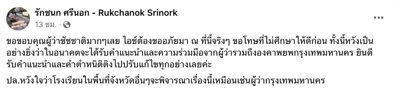 ปล.หวังใจว่าโรงเรียนในพื้นที่จังหวัดอื่นๆ จะพิจารณาเรื่องนี้เหมือนเช่นผู้ว่ากรุงเทพมหานคร.