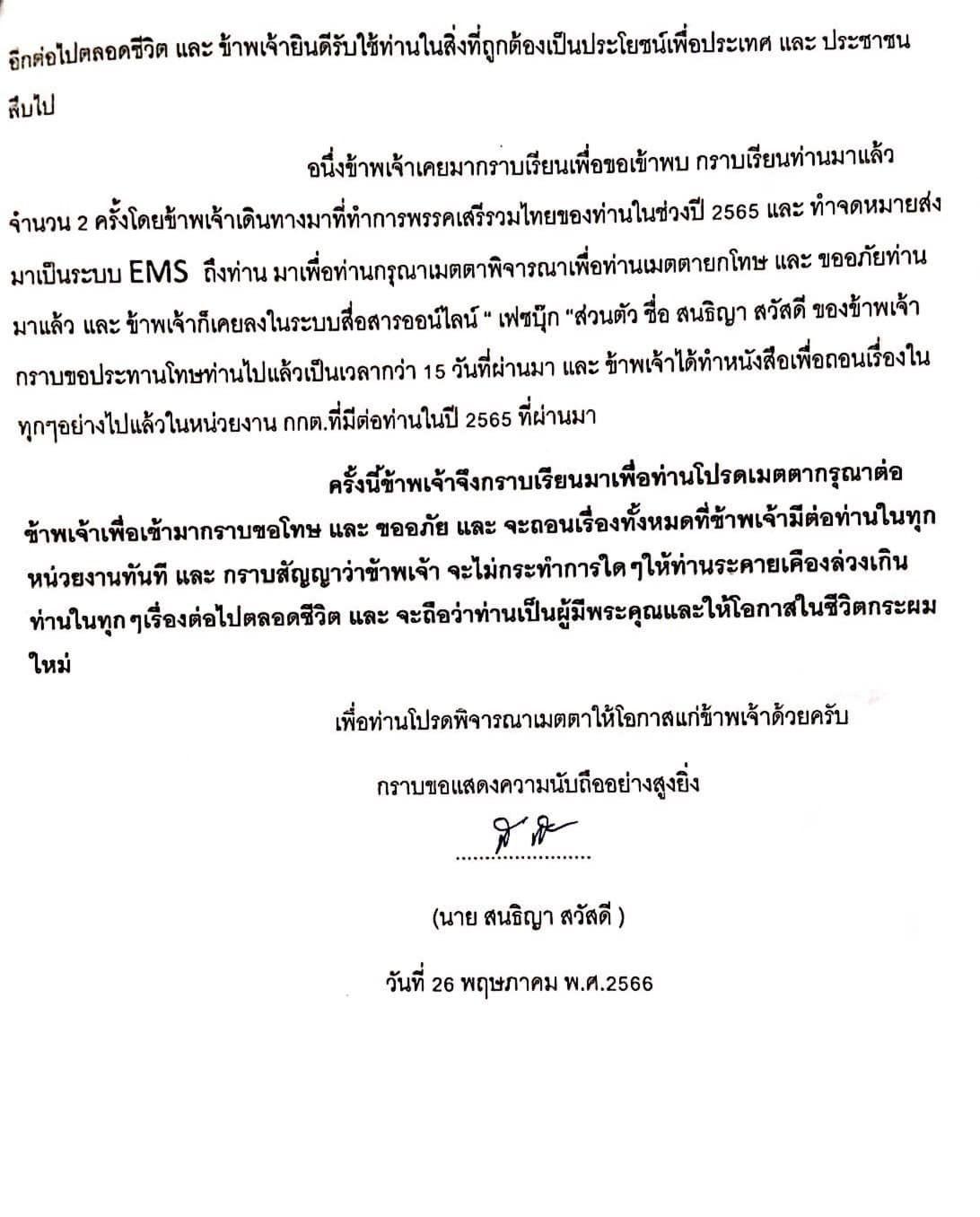 อนึ่งข้าพเจ้าเคยมากราบเรียนเพื่อขอเข้าพบ กราบเรียนท่านมาแล้วจำนวน 2 ครั้งโดยข้าพเจ้าเดินทางมาที่ทำการพรรคเสรีรวมไทยของท่านในช่วงปี 2565 และทำมาเป็นระบบ EMS ถึงท่าน มาเพื่อท่านกรุณาเมตตาพิจารณาเพื่อท่านเมตตายกโทษ และขออภัยท่านมาแล้ว และข้าพเจ้าก็เคยลงในระบบสื่อสารออนไลน์ เฟซบุ๊กส่วนตัว ชื่อ สนธิญา สวัสดี ของข้าพเจ้า กราบขอประทานโทษท่านไปแล้วเป็นเวลากว่า 15 วันที่ผ่านมา และ ข้าพเจ้าได้ทำหนังสือเพื่อถอนเรื่องในทุกๆ อย่างไปแล้วในหน่วยงาน กกต. ที่มีต่อท่านในปี 2565 ที่ผ่านมา