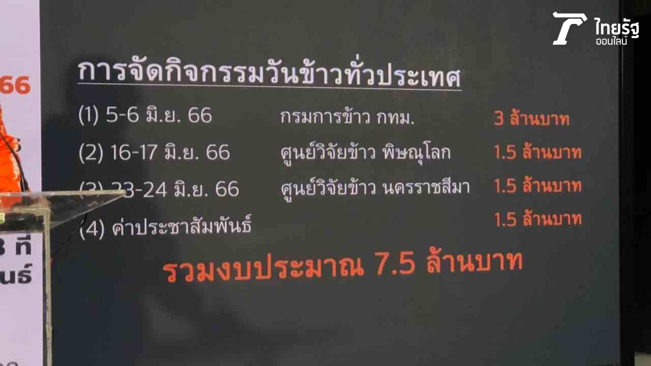 แต่เมื่อ 19 เม.ย. ที่ผ่านมา เกิดเหตุการณ์ทำให้ต้องเปลี่ยนแผน จัดงานเหลือแค่วันที่ 5-6 มิ.ย. ที่กรมการข้าวแทน และต้องลดงบประมาณลงมาเหลือเพียง 3 ล้านบาท รวมถึงการจัดงานในศูนย์วิจัยข้าวจังหวัดพิษณุโลก และนครราชสีมา จังหวัดละ 1.5 ล้านบาท และค่าประชาสัมพันธ์ อีก 1.5 ล้านบาท รวมแล้วเป็นงบประมาณ 7.5 ล้านบาท