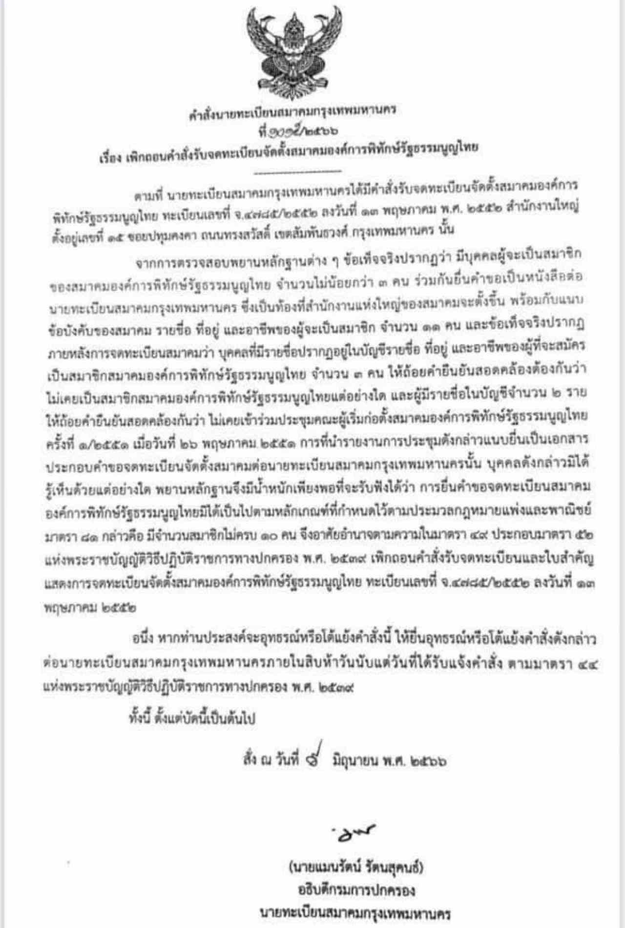 วันที่ 9 มิ.ย. 66 ผู้สื่อข่าวรายงานว่า นายแมนรัตน์ รัตนสุคนธ์ อธิบดีกรมการปกครอง ในฐานะนายทะเบียนสมาคมกรุงเทพมหานคร ได้สั่งเพิกถอนคำสั่งรับจดทะเบียน และใบสำคัญแสดงการจดทะเบียนจัดตั้งสมาคมองค์การพิทักษ์รัฐธรรมนูญไทย ของ นายศรีสุรรณ จรรยา แล้ว