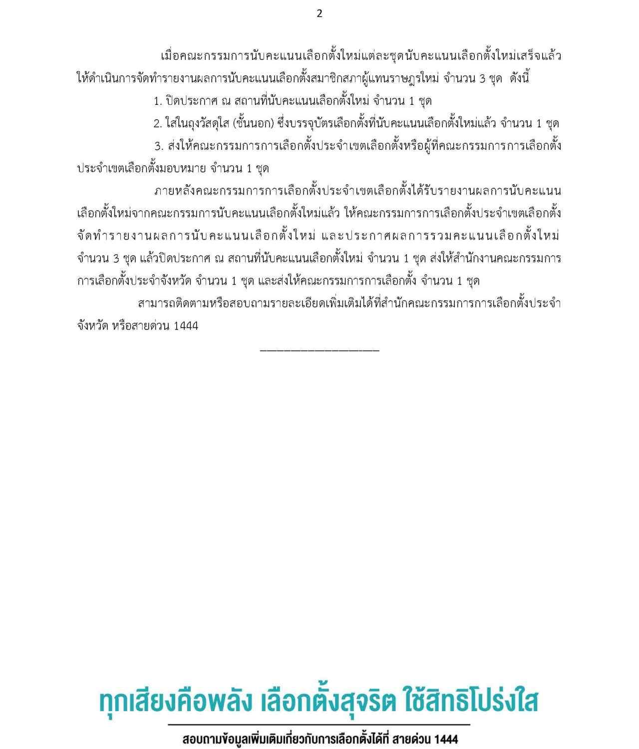 ภายหลังคณะกรรมการการเลือกตั้งประจําเขตเลือกตั้ง ได้รับรายงานผลการนับคะแนนเลือกตั้งใหม่ จากคณะกรรมการนับคะแนนเลือกตั้งใหม่แล้ว ให้คณะกรรมการการเลือกตั้งประจําเขตเลือกตั้ง จัดทํารายงานผลการนับคะแนนเลือกตั้งใหม่ และประกาศผลการรวมคะแนนเลือกตั้งใหม่ จํานวน 3 ชุด แล้วปิดประกาศ ณ สถานที่นับคะแนนเลือกตั้งใหม่ จํานวน 1 ชุด ส่งให้สํานักงานคณะกรรมการ การเลือกตั้งประจําจังหวัด จํานวน 1 ชุด และส่งให้คณะกรรมการการเลือกตั้ง จํานวน 1 ชุด สามารถติดตามหรือสอบถามรายละเอียดเพิ่มเติมได้ที่สํานักคณะกรรมการการเลือกตั้งประจํา