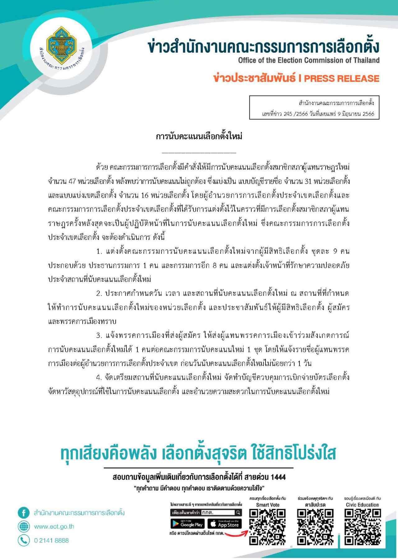 วันที่ 9 มิถุนายน 2566 กกต.ออกประกาศ ด้วย คณะกรรมการการเลือกตั้งมีคําสั่งให้มีการนับคะแนนเลือกตั้งสมาชิกสภาผู้แทนราษฎรใหม่ จํานวน 47 หน่วยเลือกตั้ง หลังพบว่าการนับคะแนนไม่ถูกต้อง ซึ่งแบ่งเป็น แบบบัญชีรายชื่อ จํานวน 31 หน่วยเลือกตั้ง และแบบแบ่งเขตเลือกตั้ง จํานวน 16 หน่วยเลือกตั้ง โดยผู้อำนวยการการเลือกตั้งประจําเขตเลือกตั้ง และคณะกรรมการการเลือกตั้งประจําเขตเลือกตั้งที่ได้รับการแต่งตั้งไว้ในคราวที่มีการเลือกตั้งสมาชิกสภาผู้แทนราษฎรครั้งหลังสุด จะเป็นผู้ปฏิบัติหน้าที่ในการนับคะแนนเลือกตั้งใหม่ ซึ่งคณะกรรมการการเลือกตั้ง ประจําเขตเลือกตั้ง จะต้องดําเนินการ ดังนี้