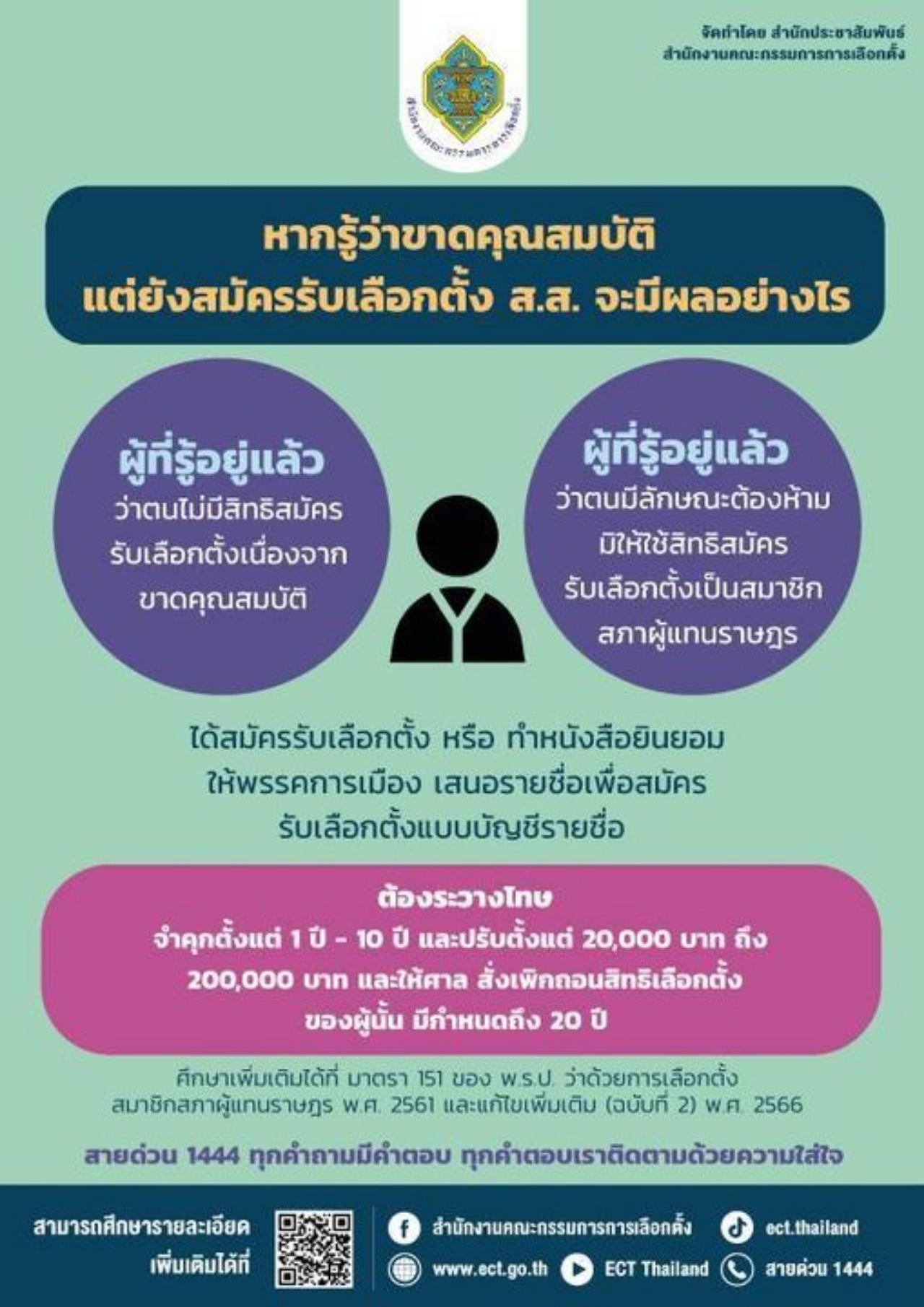คณะกรรมการการเลือกตั้ง เผยแพร่ประกาศ หากรู้ว่าขาดคุณสมบัติแต่สมัครรับเลือกตั้ง ส.ส. โทษสูงจำคุกมากถึง 10 ปี ปรับสูงสุด 2 แสนบาท และเพิกถอนสิทธิเลือกตั้ง 20 ปี แนะศึกษากฎหมายเพิ่มตาม ม.151