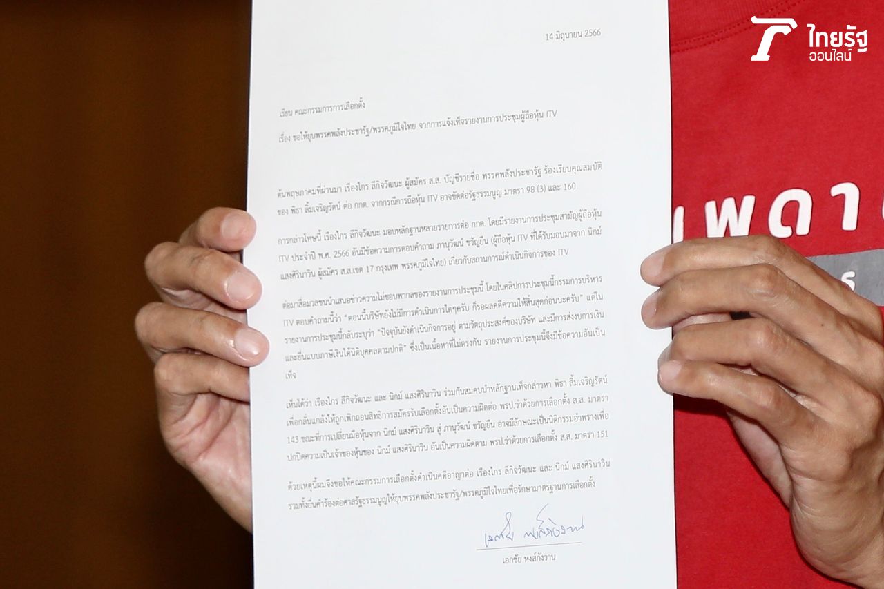 วันที่ 14 มิถุนายน 2566 เมื่อเวลา 13.30 น. ที่สำนักงานคณะกรรมการการเลือกตั้ง (กกต.) นายเอกชัย หงส์กังวาน นักเคลื่อนไหวทางการเมือง ได้เดินทางมายื่นร้องเรียนต่อ คณะกรรมการการเลือกตั้ง (กกต.) ให้ตรวจสอบกรณีที่นายเรืองไกร ลีกิจวัฒนะ ได้ยื่นเรื่องให้ตรวจสอบ การถือหุ้นไอทีวี ซึ่งหนึ่งในหลักฐาน คือ รายงานการประชุม ที่ระบุว่า มีผู้สอบถามในที่ประชุม คือ นายภานุวัฒน์ ขวัญยืน หนึ่งในผู้ถือหุ้นไอทีวี ได้สอบถามไปยัง นายคิมห์ สิริทวีชัย กรรมการผู้อำนวยการ บริษัท อินทัช โฮลดิ้งส์ จำกัด ซึ่งเป็นประธานในที่ประชุม ว่า ไอทีวี ยังเป็นสื่ออยู่หรือไม่ โดยในรายงานระบุว่า ยังดำเนินกิจการอยู่