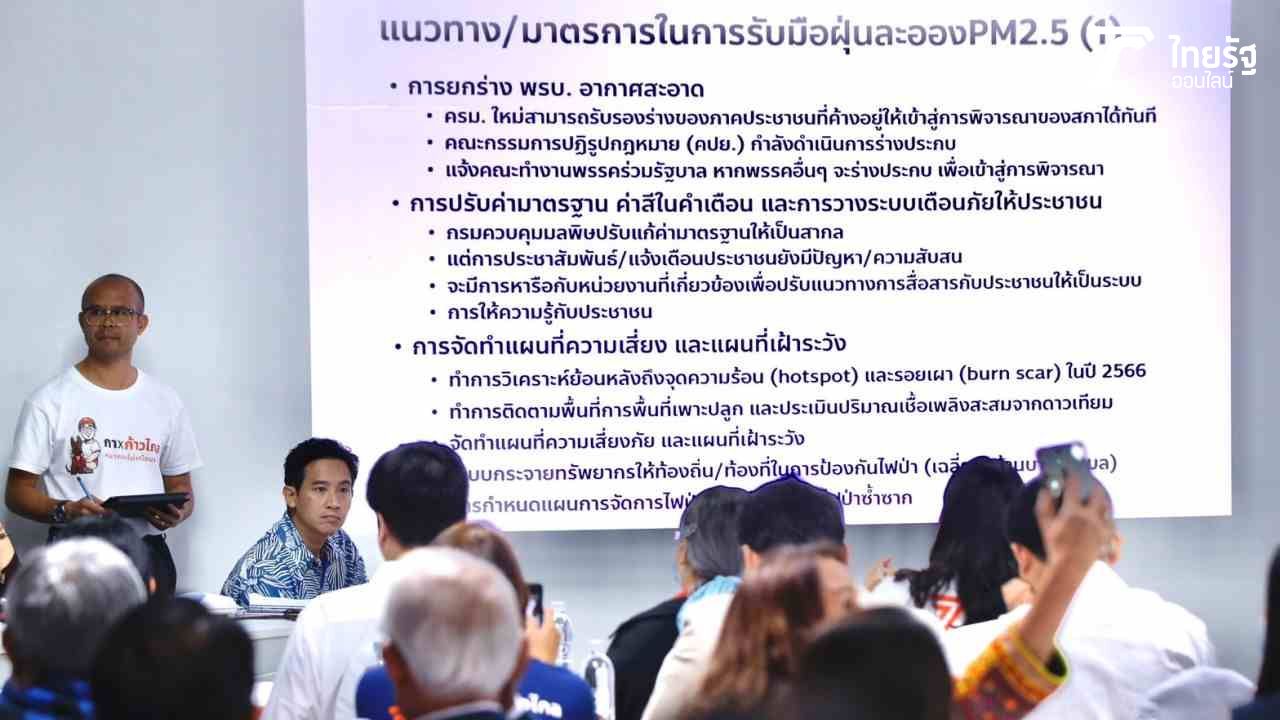 โดย นายพิธา กล่าวในที่ประชุมว่า ปัญหาหมอกควันเป็นปัญหาสำคัญในพื้นที่ เพราะครั้งเมื่อลงพื้นที่ก็เจอกับปัญหานี้ กลับกรุงเทพฯ ไปป่วยอยู่หลายวัน ซึ่งขณะนี้จากการศึกษาของทีมพรรคก้าวไกลพบว่า ปัจจุบันงบประมาณแก้ปัญหาที่ได้มาเพียง 85 ล้านบาท ไม่มีความสอดคล้อง งบประมาณการแก้ปัญหาถือว่าน้อยกว่าความเสียหาย ซึ่งเป็นเบี้ยหัวแตกที่กระจายไปหลายหน่วยงาน ทำให้การแก้ปัญหาไม่ยั่งยืน เพราะฉะนั้นหลังจากนี้ถ้าได้เป็นรัฐบาลจะมีการแก้ไขปัญหาอย่างเป็นระบบและจริงจัง นอกจากนี้แล้วปัญหาหมอกควันนั้นจากการศึกษาพบว่าสร้างความเสียหายจากเศรษฐกิจจังหวัดเชียงใหม่มากกว่า 10,000 ล้านบาทด้วย