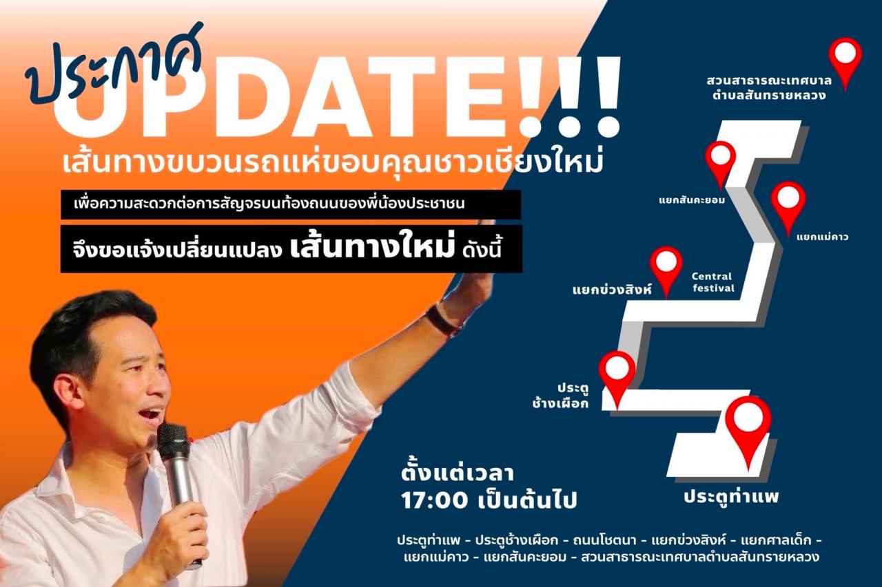 พรรคก้าวไกล เปลี่ยนเส้นทางขบวนรถแห่ อ้าย “ทิม พิธา” ขอบคุณจาวเจียงใหม่ หลังประชาชนกังวลเส้นทางเดิม อาจยิ่งทำให้จราจรติดขัด