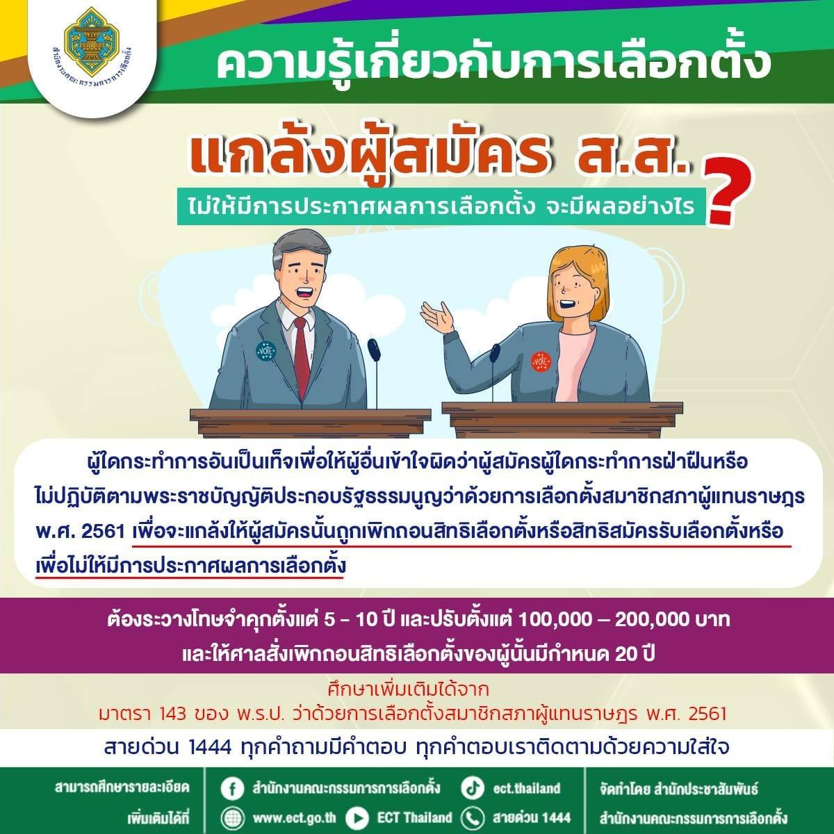 วันที่ 19 มิถุนายน 2566 สำนักงานคณะกรรมการการเลือกตั้ง หรือ กกต. โพสต์ความรู้เกี่ยวกับการเลือกตั้ง ในประเด็น “แกล้งผู้สมัคร ส.ส. ไม่ให้มีการประกาศผลการเลือกตั้ง จะมีผลอย่างไร?”
