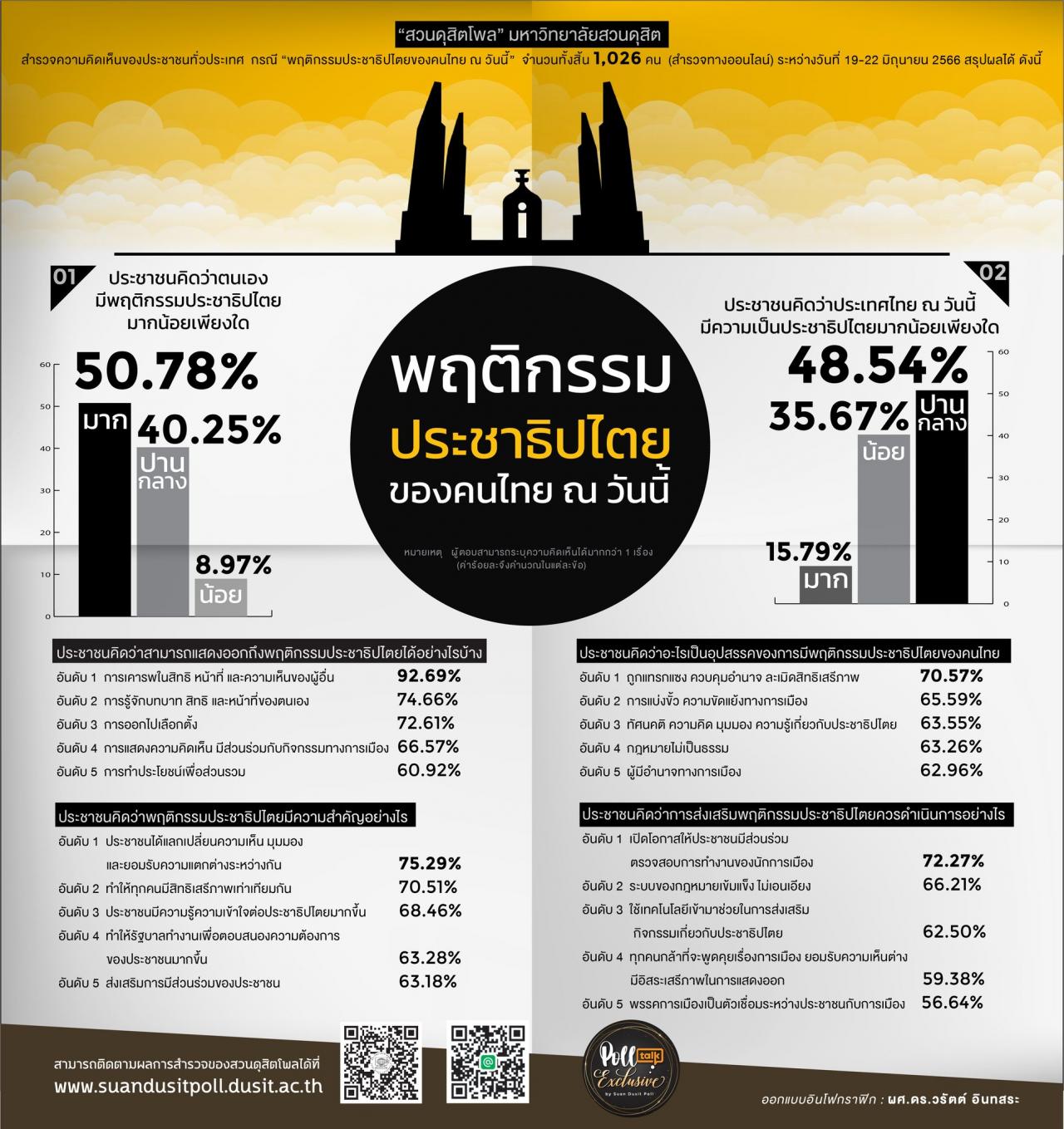 วันที่ 25 มิถุนายน 2566 สวนดุสิตโพล มหาวิทยาลัยสวนดุสิต สำรวจความคิดเห็นของประชาชนทั่วประเทศ กรณีพฤติกรรมประชาธิปไตยของคนไทย ณ วันนี้ โดยเป็นการสำรวจทางออนไลน์ จำนวนทั้งสิ้น 1,026 คน ระหว่างวันที่ 19-22 มิถุนายน 2566 มีผลสำรวจดังนี้