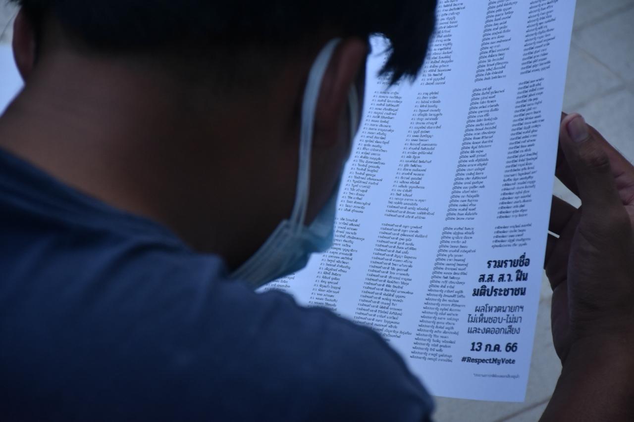 วันที่ 14 กรกฎาคม 2566 เมื่อ 18.00 น. ผู้สื่อข่าวรายงานบรรยากาศเวทีม็อบสนับสนุนพรรคก้าวไกล ที่ประกอบไปด้วยเครือข่ายมวลชนราษฎรกลุ่มต่างๆ เริ่มเปิดขึ้นด้วยการร้องเพลงปฏิวัติฝรั่งเศส ที่เนื้อหาสื่อถึงความเหลื่อมล้ำ และความอยุติธรรมของสังคมฝรั่งเศสในยุคหนึ่ง โดยมีมวลชนด้อมส้มทุกเพศทุกวัยเดินทางมารวมตัวเนืองแน่น ทั้งบริเวณหน้าลานหอศิลปวัฒนธรรมแห่งกรุงเทพมหานคร และบนลานสกายวอล์กสี่แยกปทุมวัน รวมถึงมีการแจกป้ายที่มีข้อความว่า ยกเลิก ส.ว. ทวงคืนอำนาจประชาชน ประเทศนี้ไม่ความจำเป็นต้องมี ส.ว. ให้ประชาชนชู และชวนตะโกนคำว่า “Respect my vote ถ้าไม่เลือกก็ออกไป”