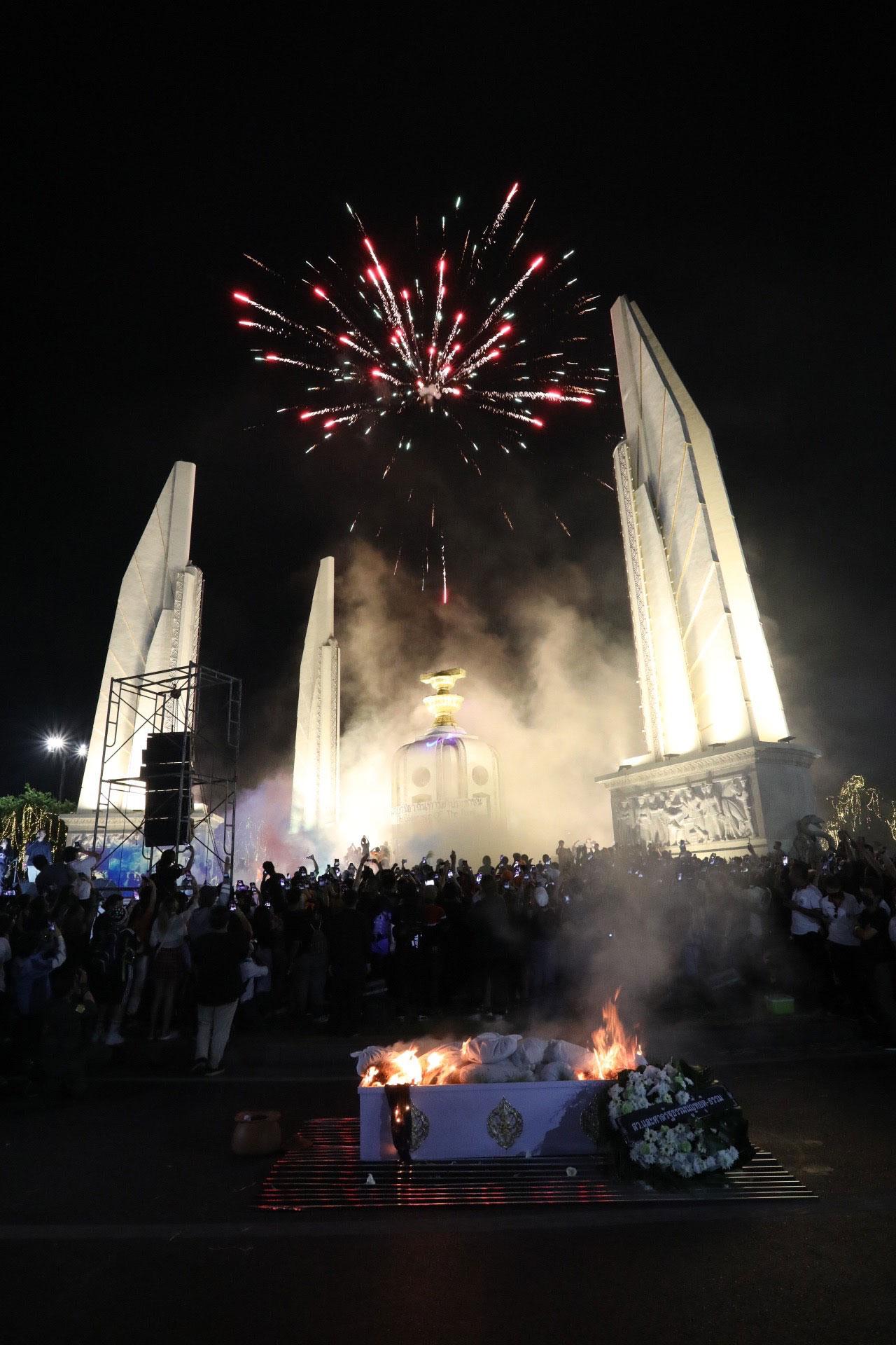 อีกด้านหนึ่ง ที่อนุสาวรีย์ประชาธิปไตย ถนนราชดำเนินกลาง กลุ่มแนวร่วมประชาชน นำโดยนายสมยศ พฤกษาเกษมสุข แกนนำกลุ่ม 24 มิถุนา ประชาธิปไตย น.ส.ธนพร วิจันทร์ กลุ่มเครือข่ายแรงงานเพื่อสิทธิประชาชน นายชาติชาย แกดำ กลุ่มราษฏร ฯลฯ นัดมวลชนผู้สนับสนุนพรรค ก.ก.รวมตัวจัดกิจกรรมชุมนุมใส่ชุดดำ “ฌาปนกิจ สว.” โดยใช้พื้นที่บนฐานอนุสาวรีย์ประชาธิปไตยตั้งเวทีปราศรัย เปิดช่องจราจรโดยรอบไว้ให้สัญจรไปมาได้ มีมวลชนที่มาจากการชุมนุมหน้ารัฐสภา ทยอยเดินทางมาสมทบ จับกลุ่มพูดคุยกันเรื่องความไม่เป็นธรรมที่เกิดกับพรรค ก.ก.ต่อมา น.ส.ทานตะวัน ตัวตุลานนท์ หรือตะวัน นายนภสินธุ์ ตรีรยาภิวัฒน์ หรือสายน้ำ นายศุทธวีร์ สร้อยคำ หรือบังเอิญ ศิลปินอิสระที่ถูกดำเนินคดีข้อหาพ่นสีกำแพงวัดพระแก้ว สวมเสื้อดำปีนขึ้นไปนั่งอยู่บนตัวอนุสาวรีย์ประชาธิปไตยแสดงออกเชิงสัญลักษณ์
