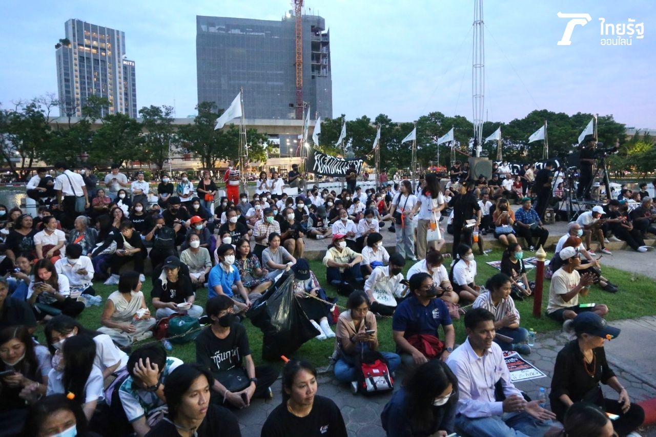 ทางด้าน นายอานนท์ นำภา ทนายความจากศูนย์ทนายเพื่อสิทธิมนุษยชน แกนนำม็อบราษฎร ขึ้นปราศรัยเมื่อเวลา 19.30 น. โดยมีใจความสำคัญตอนหนึ่งว่า ขณะนี้ฝ่ายตรงข้ามพยายามทำให้พรรคเพื่อไทยและพรรคก้าวไกลแตกกัน โดยใช้เรื่องประมวลกฎหมายอาญา มาตรา 112 เป็นข้ออ้าง ดังนั้น เราต้องเป็นเกราะเป็นเชือกไม่ให้ 2 พรรคนี้แตก เพราะถ้าพรรคก้าวไกลถูกถีบไปเป็นฝ่ายค้าน แล้วศาลรัฐธรรมนูญสั่งยุบพรรคก้าวไกล ตัดสิทธิทางการเมือง นายพิธา ลิ้มเจริญรัตน์ หัวหน้าพรรคก้าวไกล เป็นเวลา 10 ปี และ สส. ทยอยติดคุก เราจะไม่มี สส.น้ำดี ไปอภิปรายเรื่องสถาบัน เรื่องงบทหาร ฯลฯ จึงต้องเป็นกาวใจให้จับมือกันฝ่าวิกฤตินี้ไปให้ได้