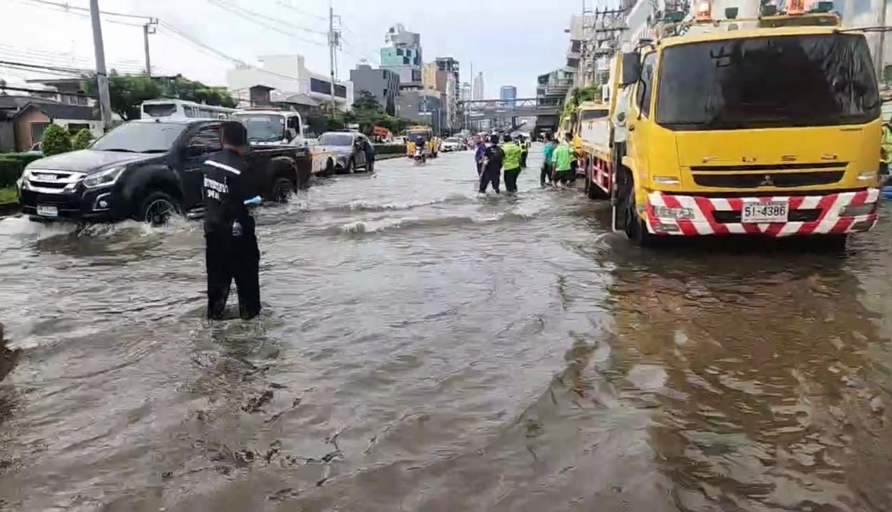 “เมื่อคืนฝนตกมาแบบไม่รู้ตัว เพราะตอนก่อนนอนยังไม่เห็นกลุ่มฝน ฝนมาจากทางชลบุรีและเคลื่อนตัวมาอย่างรวดเร็ว เจ้าหน้าที่ก็มาตั้งแต่เที่ยงคืนตี 1 ตอนนี้สถานการณ์เริ่มดีขึ้นแล้ว เมื่อคืนที่มาตอนตี 2 น้ำท่วมสูงขึ้นถึงหญ้าที่อยู่เกาะกลางถนน แต่ตอนนี้ลดระดับลงมา คาดว่าน่าจะลงมาประมาณ 25 ซม. ก็ยังคงมีอุปสรรคอยู่ แต่คาดว่า 2 ชม. น่าจะเคลียร์ได้หมด เมื่อคืนตก 140 มม. ก็หนักพอสมควร เป็นข้อจำกัดทางกายภาพเพราะท่อระบายได้ในระดับนี้ ในระยะยาวก็คงต้องขยายท่อให้ใหญ่ขึ้น วันนี้มาเป็นกำลังให้กับเจ้าหน้าที่และได้เห็นปัญหา”