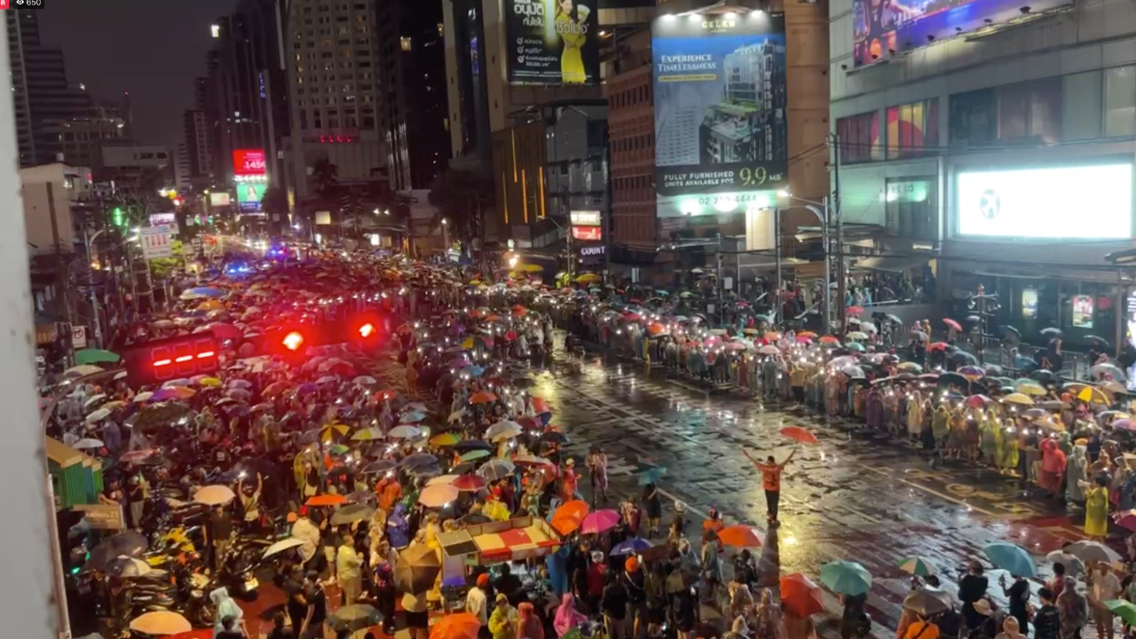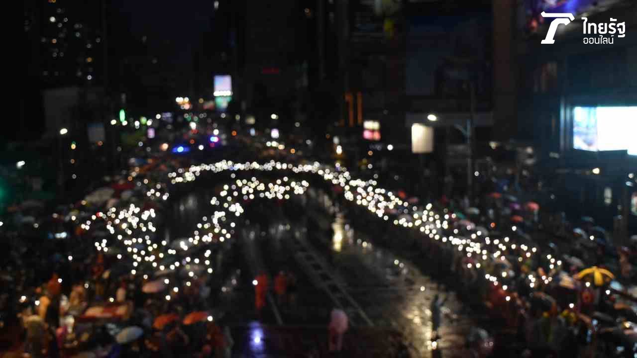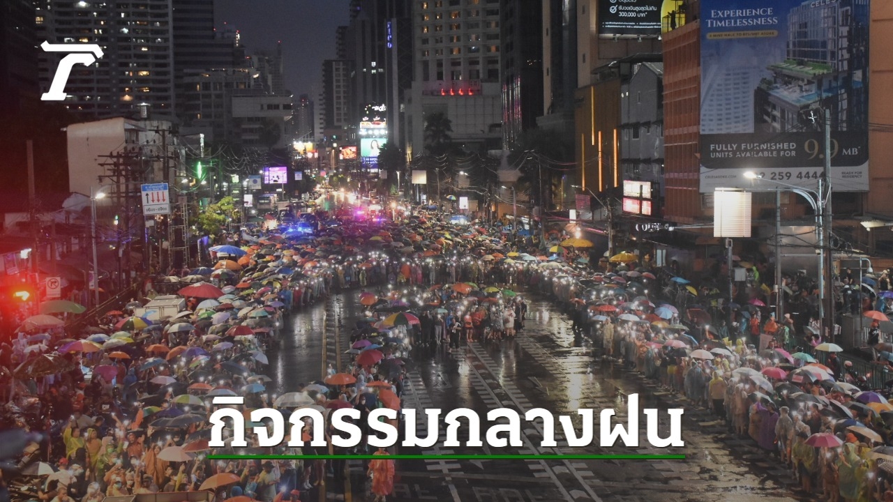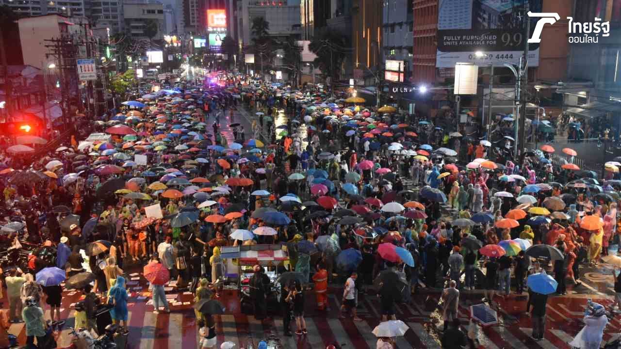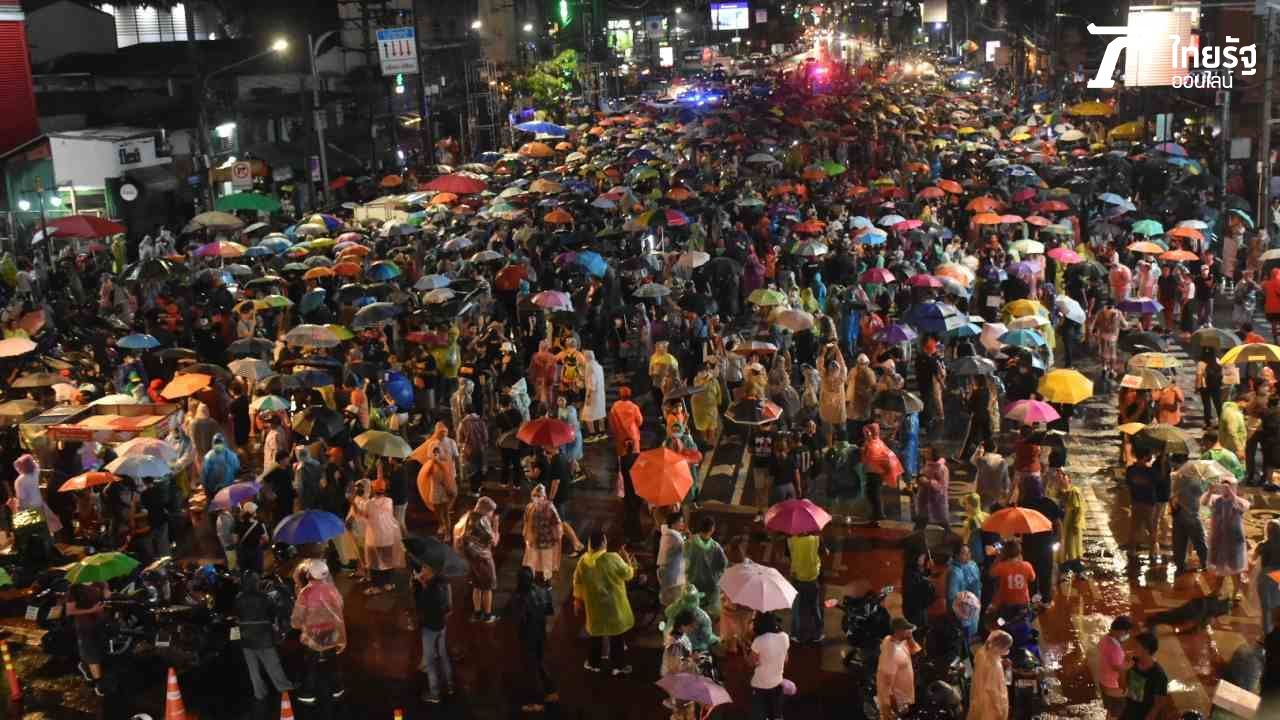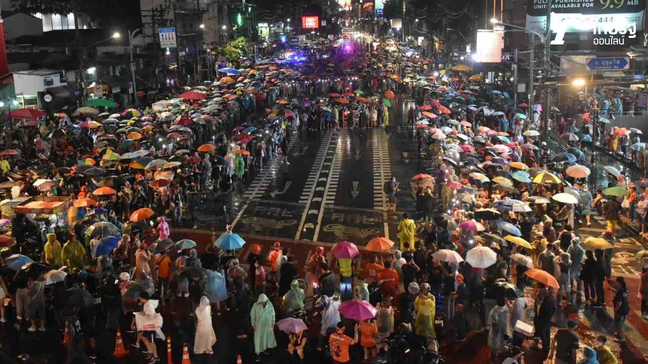 18.20 น. มวลชนที่มาร่วมชุมนุมเริ่มหลั่งไหลกันมาลงถนนมากขึ้น จนเต็มพื้นที่หน้าเวทีถนนรัชดา ฝั่งมุ่งหน้าแยกอโศกเพชร ปรากฏเป็นภาพมุมสูงที่มีประชาชนถือร่มหลากหลายสียืนชุมนุมอย่างสงบกลางฝนพรำ โดยมีแกนนำปราศรัยอยู่บนเวที