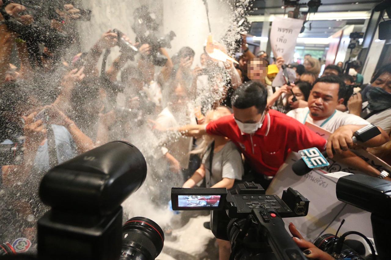 ผู้สื่อข่าวรายงานงานว่า เมื่อการหารือระหว่างแกนนำพรรคเพื่อไทยและพรรคพลังประชารัฐเสร็จสิ้น และกำลังจะเตรียมแถลงข่าว ทางกลุ่มทะลุวังจึงรีบวิ่งออกจาก Think Lab เพื่อไปดักแกนนำทั้งสองพรรค และตะโกนล้อเลียนประเด็น “มันคือแป้ง” และมีการเทช็อกมิ้นต์ทิ้งลงพื้นที่ ซึ่งพอดีกับช่วงที่ ร.อ.ธรรมนัส พรหมเผ่า ส.ส.พะเยา และประธานประสานงาน สส.พปชร. กับแกนนำพรรคลงจากห้องประชุมพอดี มีคนกรูเข้าไปแล้วสาดแป้งใส่เหล่าแกนนำพรรค จนฟุ้งกระจายไปทั่วบริเวณ เกิดความชุลมุนและมีแป้งกระเซ็นไปถูก ร.อ.ธรรมนัสเล็กน้อย ทำให้การแถลงข่าวของแกนนำทั้งสองพรรคต้องยกเลิก เปลี่ยนเป็นการแยกให้แกนนำแต่ละพรรคแถลงที่พรรคของตัวเองแทน โดยเวลา 16.40 น. ร.อ.ธรรมนัสและแกนนำพรรคพลังประชารัฐได้เดินทางออกจากพรรคเพื่อไทยทางด้านหลัง เมื่อแกนนำม็อบรู้จึงรีบวิ่งไปขวางรถยนต์ เมื่อขวางไม่สำเร็จ ก็รีบเดินทางตามไปยังพรรคพลังประชารัฐต่อ พร้อมประกาศขู่ว่า ถ้ามีการยืนยันว่าจับมือกันตั้งรัฐบาลจะกลับมาอีกทันที ไม่คิดว่าพรรคเพื่อไทยจะเปลี่ยนจุดยืนได้เร็วขนาดนี้