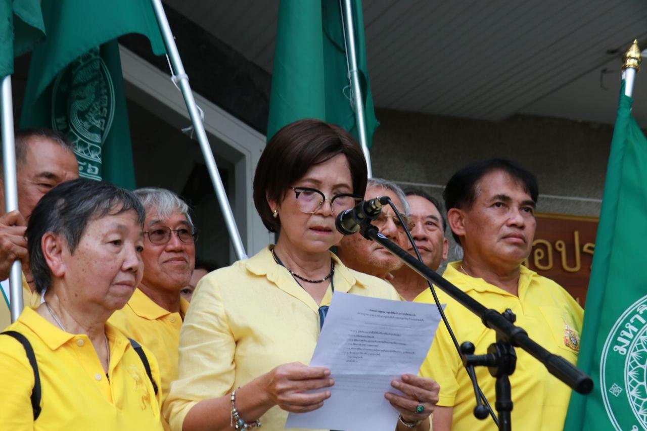 ต่อมาเวลา 17.15 น. ศ.ดร.อุทัยรัตน์ เป็นตัวแทนนิสิตเก่า มก. อ่านแถลงการณ์แสดงจุดยืนใจความว่า พวกเรานิสิตเก่า มก. หลากหลายรุ่น มาชุมนุมกัน ณ ที่นี้ เพื่อแสดงเจตนารมณ์ว่าตั้งมั่นในความจงรักภักดีต่อสถาบันพระมหากษัตริย์ เทิดทูนและหวงแหนเกียรติภูมิแห่ง มก. อันเป็นที่รักยิ่ง อีกทั้ง มก. เป็นสถาบันหลักแห่งหนึ่งของประเทศที่มีประวัติอันดีงามมานาน ผลิตบัณฑิตออกมารับใช้ประเทศชาติในภาคส่วนต่างๆ เป็นกำลังสำคัญในการขับเคลื่อนประเทศให้เจริญก้าวหน้า นอกจากจะให้ความรู้และปัญญา ซึ่งเป็นรากฐานสำคัญที่ทำให้เราเป็นเรามาได้ถึงทุกวันนี้ ยังได้หล่อหลอมจิตวิญญาณของพวกเราให้มีความจงรักภักดี และผูกพันกับสถาบันหลักของชาติ มีความเสียสละ อุทิศตน ติดดิน และมีความรักสามัคคีระหว่างกันอย่างเหนียวแน่น จึงเป็นหน้าที่ของพวกเราในการปกป้องศักดิ์ศรีและเกียรติภูมิแห่งมหาวิทยาลัย